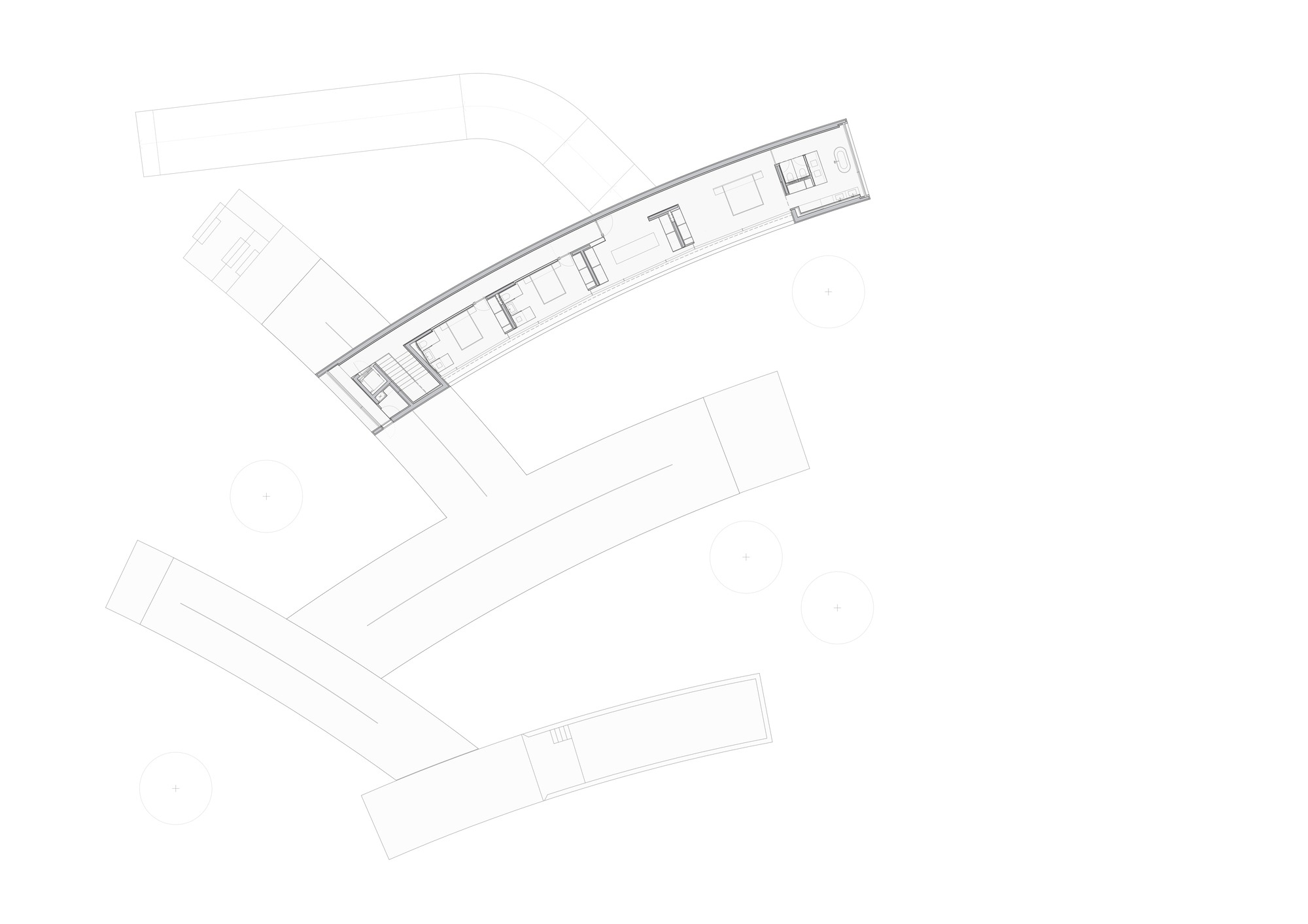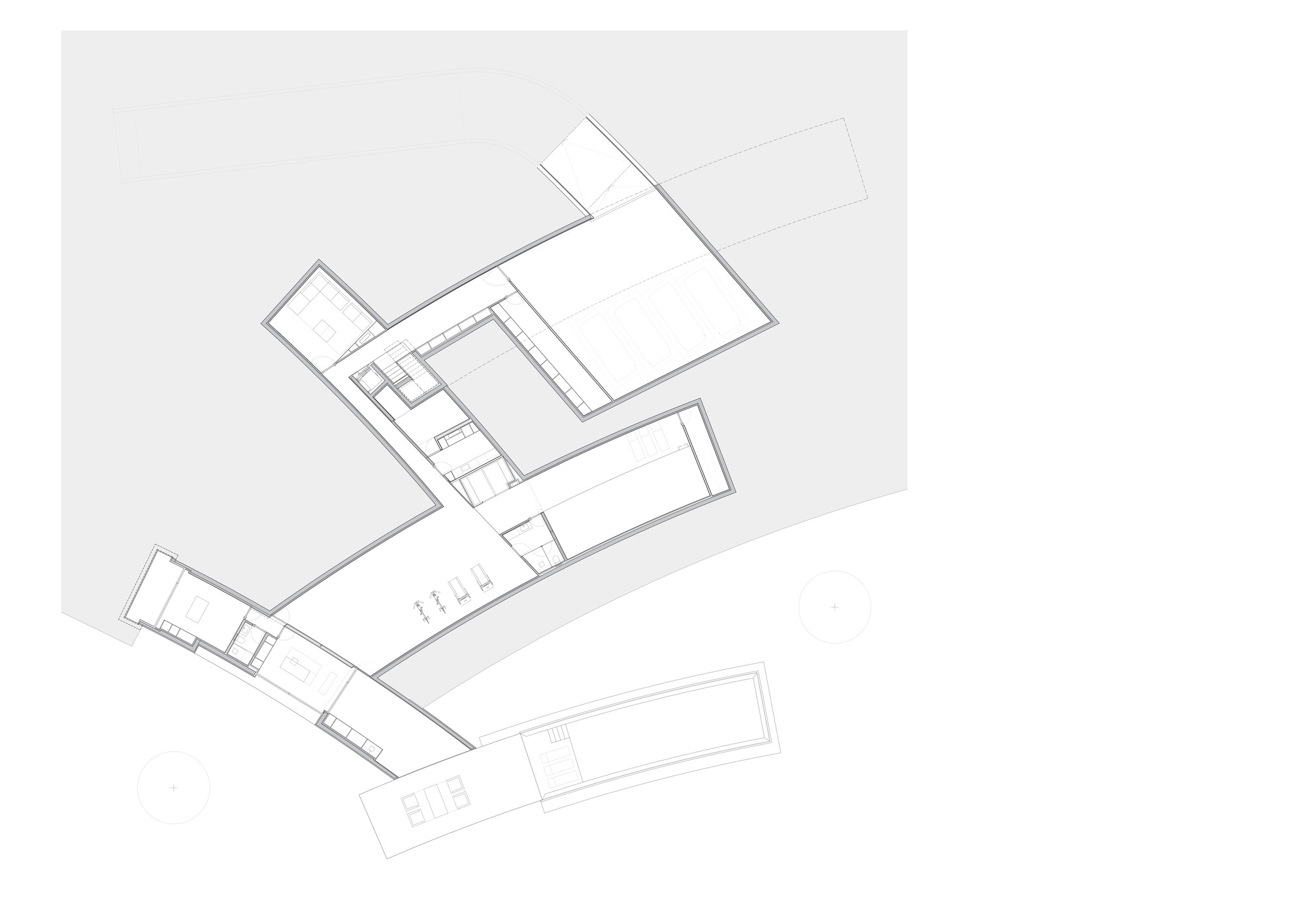 이 프로젝트는 오래된 두 가지 원형을 결합한다. 파빌리온, 열린 구조로서 중심에서 바깥으로 펼쳐지는 공간. 그리고 안마당, 보호받으면서도 하늘이 열린 공간. 건축가는 Glenn Murcutt와 Stephane Beel 등의 작품에 매료되어 왔다. 길게 늘어선 평면에서 외부와 맺는 관계 때문이다. 건축 덩어리들은 큰 반경의 곡선을 그리는 길고 통과하는 요소로 구성된다. 이 덩어리들은 나란히 배치되어 동선을 최적화한다. 이런 배치 속에서 각자의 정체성을 지닌 5개 정원이 생겨난다. 거의 열린 안마당처럼, 건축의 배치가 만들어낸 공간들이다. 각 정원은 고유한 분위기를 제공하고 시각적 연결망을 증폭시킨다. 외부가 전체 경험 속에서 항상 살아있는 존재가 되도록 한다. 이 공간들은 시간이 지나면서 들어올 큰 나무들을 품을 준비가 되어 있다.