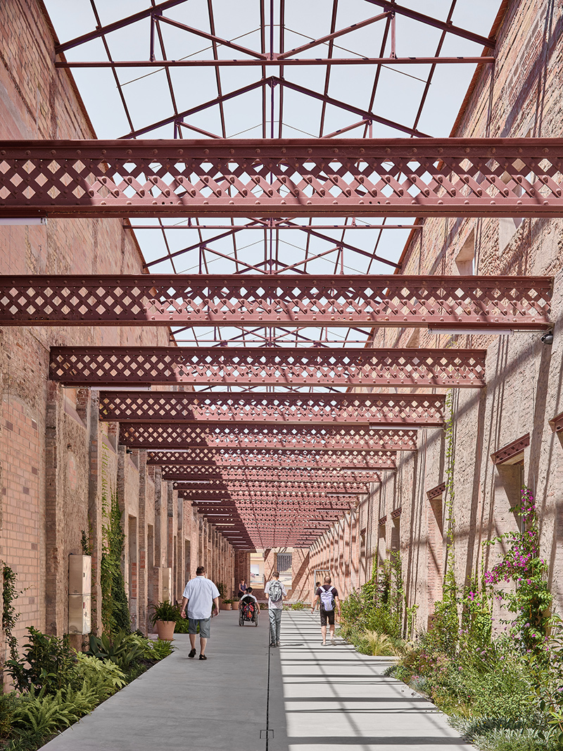 두 창고 건물 사이로 원래 서비스용 거리가 있었다. 시간이 지나며 그 위로 금속 구조와 벽돌 볼트로 이루어진 임시 건물들이 들어섰다. 수십 년간 이곳에서 다양한 산업 활동이 이어졌고, 건물들은 변형되고 덧붙여졌다. 이 복합단지의 가치는 완벽한 보존 상태가 아니라 창고-거리-창고라는 도시 구조, 산업창고라는 원형적 성격, 그리고 변화가 켜켜이 쌓인 불완전함 자체에 있다.