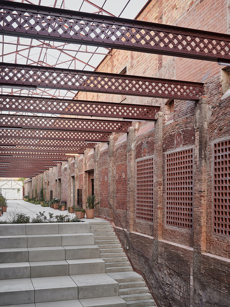 바르셀로나의 오래된 산업단지 한가운데, 19세기 말 증기공장 Vapor Cortès의 건물들이 서 있다. 붉은 벽돌로 쌓아 올린 내력벽이 건물의 외곽을 감싼다. 3미터마다 벽기둥이 서고, 그 사이로 창이 열린다. 규칙적인 리듬이 벽을 따라 이어진다. 12미터 너비의 공간을 가로지르는 목재 트러스가 지붕을 떠받친다. 세월이 흐르며 비가 새고 목재가 상했지만, 구조의 리듬은 여전히 벽기둥과 같은 간격으로 이어진다. 지붕은 나무 서까래와 가로대 위에 스페인 기와를 얹은 전통 방식이다.
