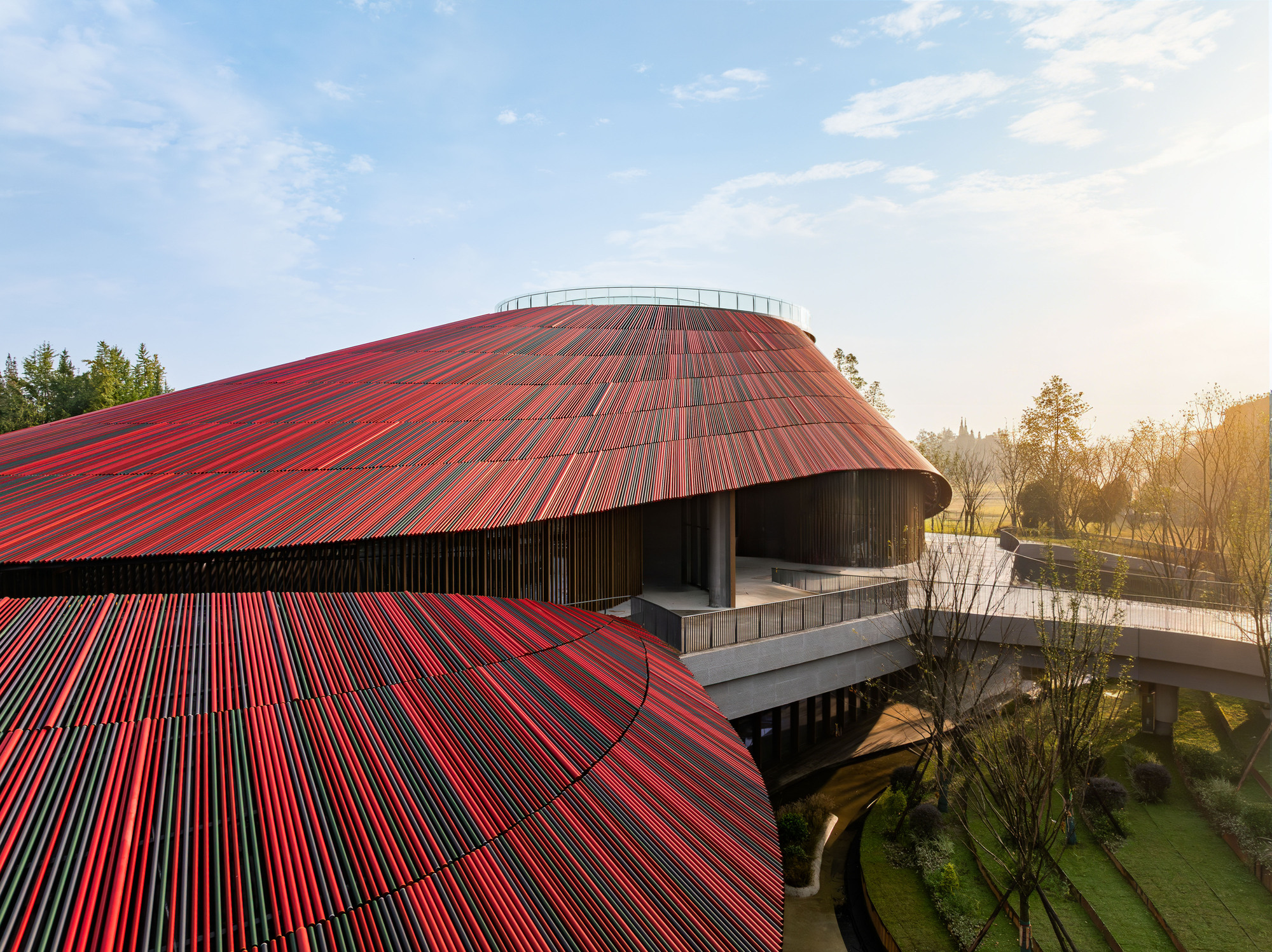 북쪽의 작은 지붕은 땅에서 솟아오르고, 남쪽 지붕은 침하 안뜰로 파고든다. 세 개의 지붕면이 겹치며 서부 쓰촨 건축 특유의 경쾌함을 드러낸다. 전통의 회색 기와는 혁신적인 "고추색 요소"로 대체되었다. 이는 건조 과정에서 고추가 녹색에서 빨강, 검은색으로 변하는 색 변화에서 영감을 받았다.