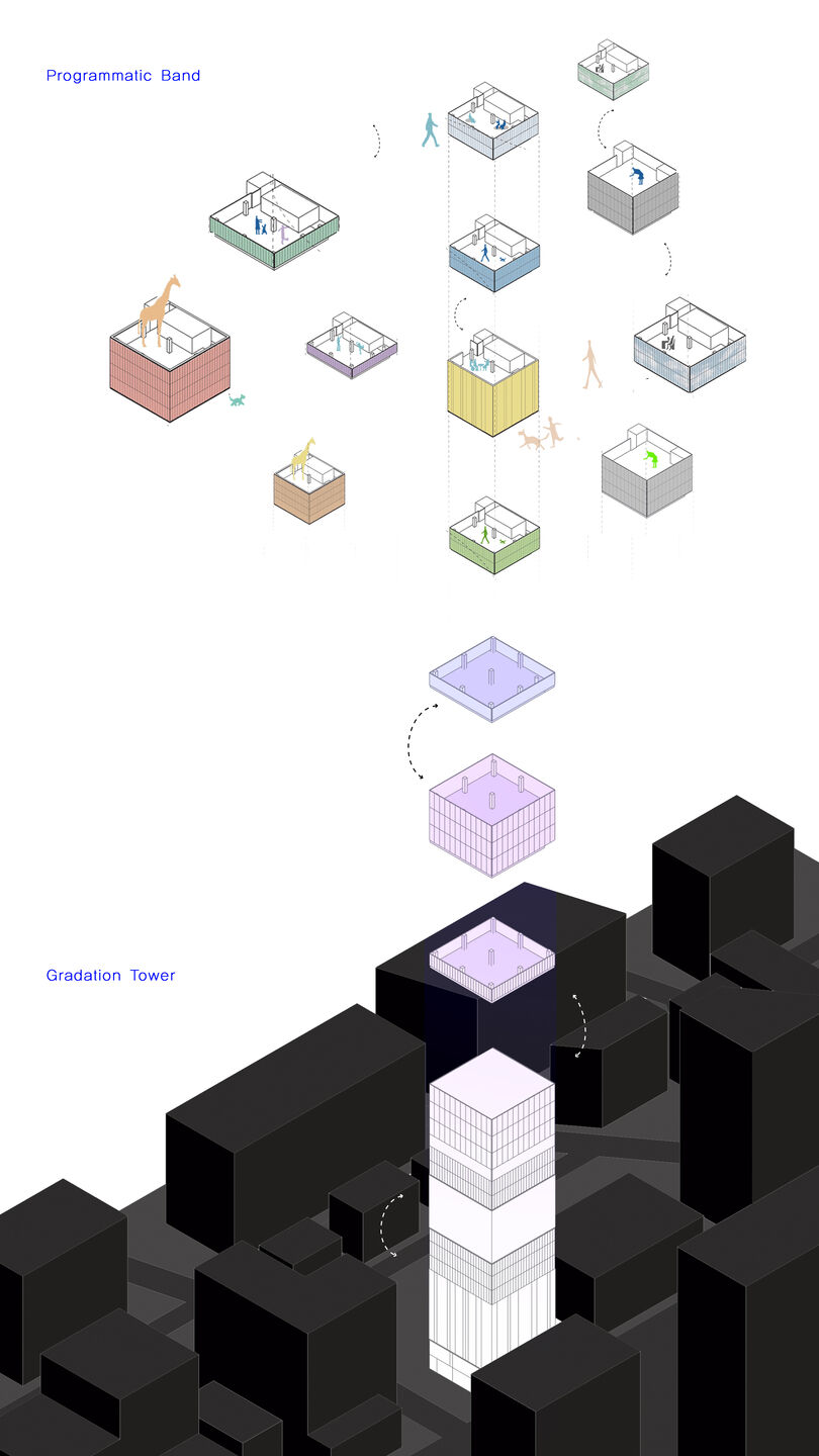 This Hospital tower proposes an editable gradation tower, which responds to the evolving program through the flexibility of a vertical stacking arrangement. the gradation skin made by the plastic arrangement of Programmatic Bands will be an element that adapts to the environment as it changes according to the nature or vertical arrangement of the internal program. Actually, even during the construction process, there was a change in the stacking arrangement as the program was changed twice. The Programmatic Bands thus formed give possibility for vertically free stacking.