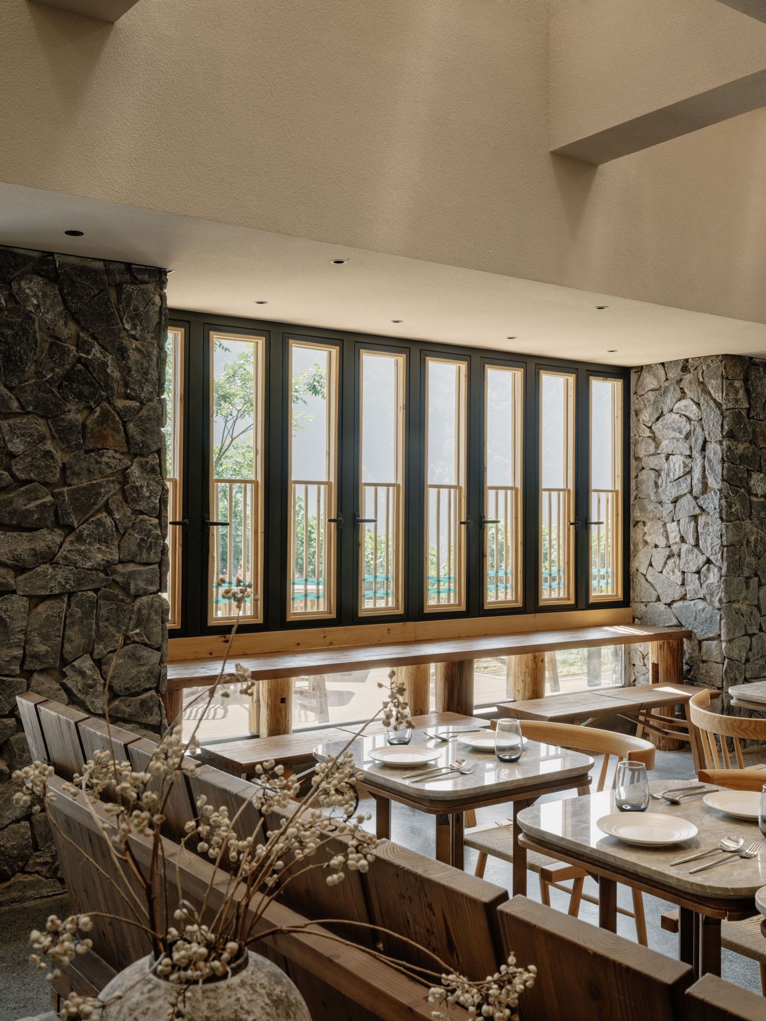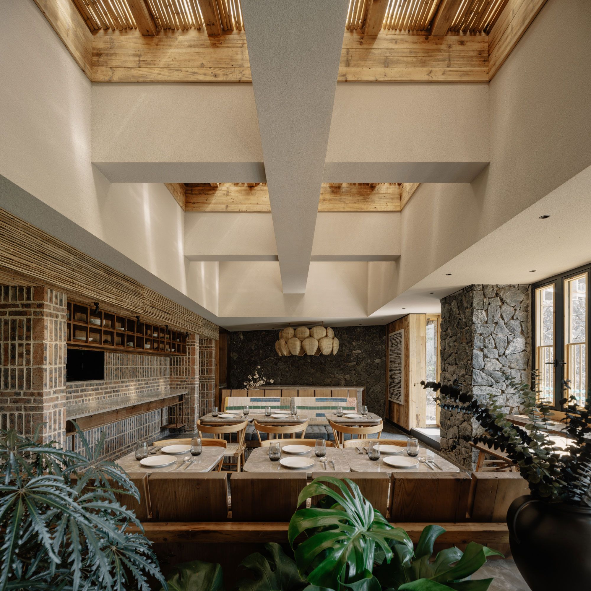 로비 옆의 다목적 공간에는 버려진 산장 오두막에서 수거한 목재로 만든 오두막 형태의 구조물이 무대처럼 자리 잡고 있다. 그 위를 덮은 체크무늬 캐노피는 고대 쓰촨성 서부의 지붕 타일에서 영감을 받은 것이다. 기존 주차장을 확장해 만든 1층 레스토랑 역시 재생의 미학을 이어간다. 철거 과정에서 나온 붉은 벽돌은 주방과 홀을 구분하는 벽이 되었고, 남은 대나무 비계 발판은 천장의 장식 구조물로 변모했다. 자투리 돌은 벽 마감재로, 현지에서 채집한 자갈은 테라조 바닥 속에 박혀 새로운 생명을 얻었다. 다채로운 질감이 풍성하게 어우러져 있지만, 정직하고 단순한 가구 디자인 덕분에 공간은 고요하고 절제된 분위기를 유지한다.