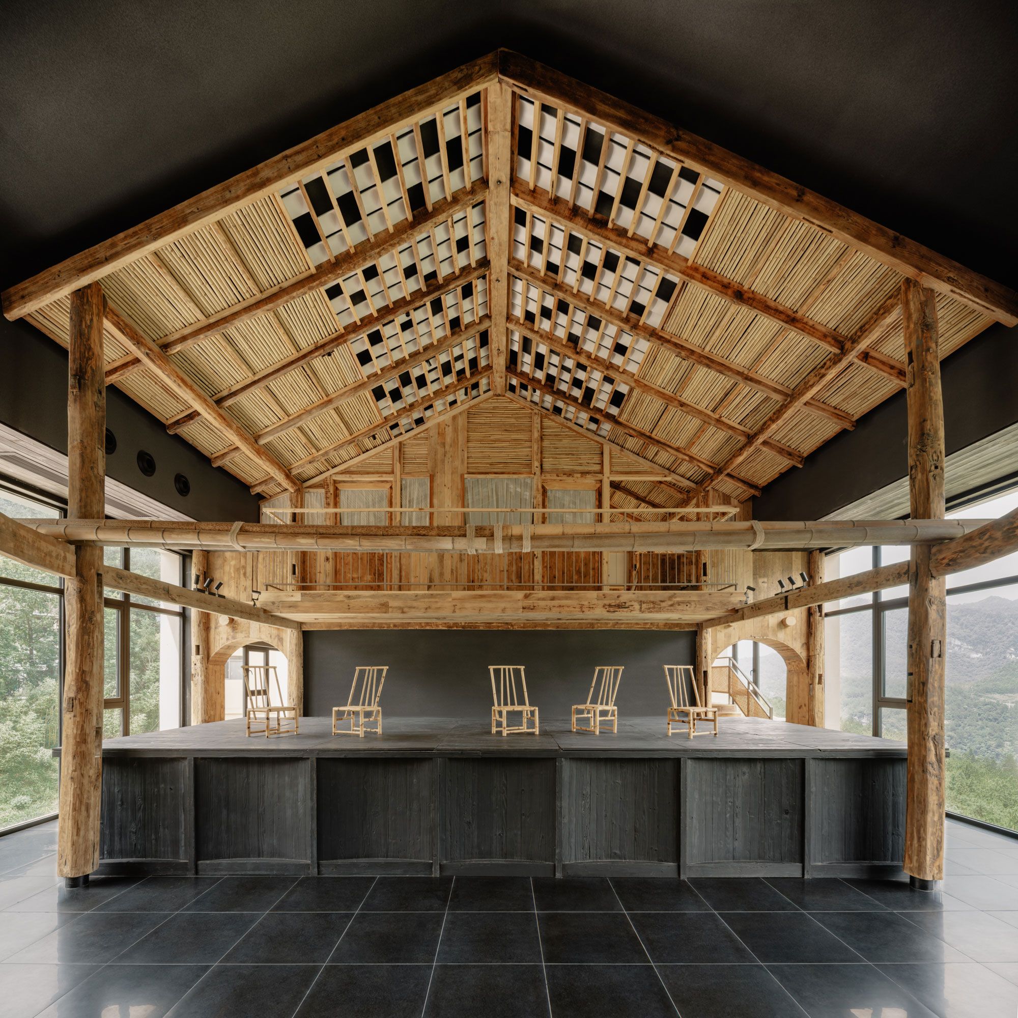 In a multi-purpose space adjoining the lobby, a hut like structure made from timber salvaged from an abandoned mountain cabin demarcates a stage for performances, topped with a chequered canopy inspired by the bright tiles of ancient Western Sichuan roofs.