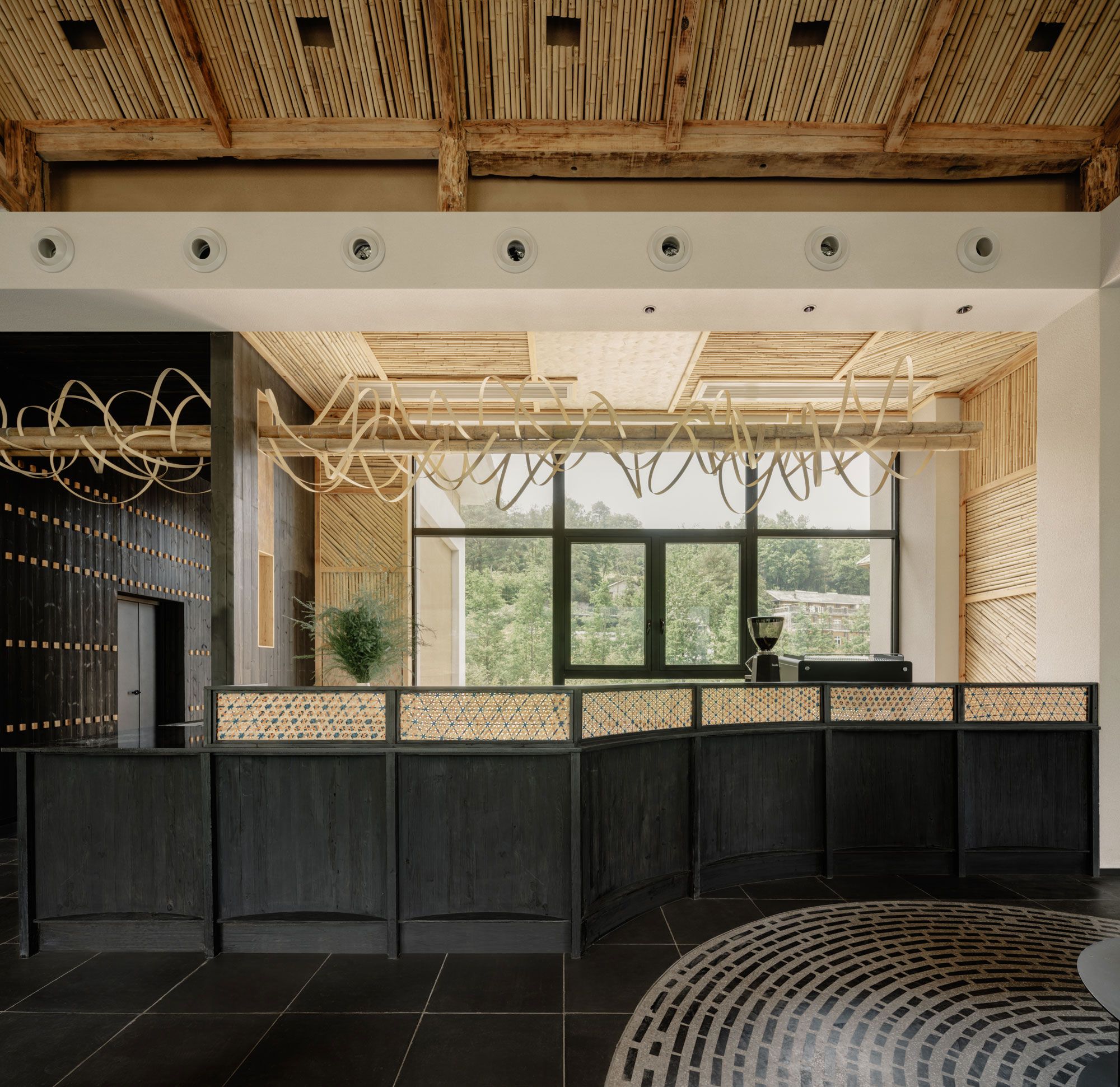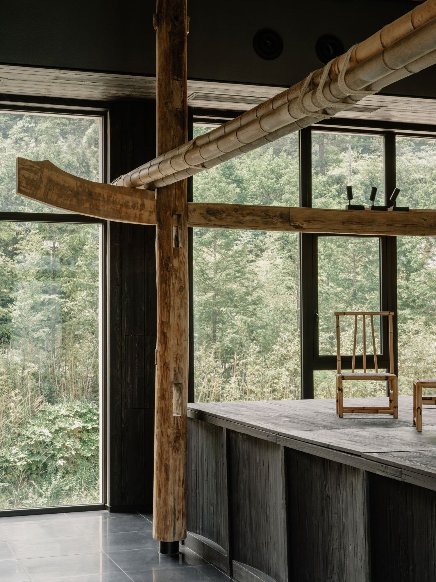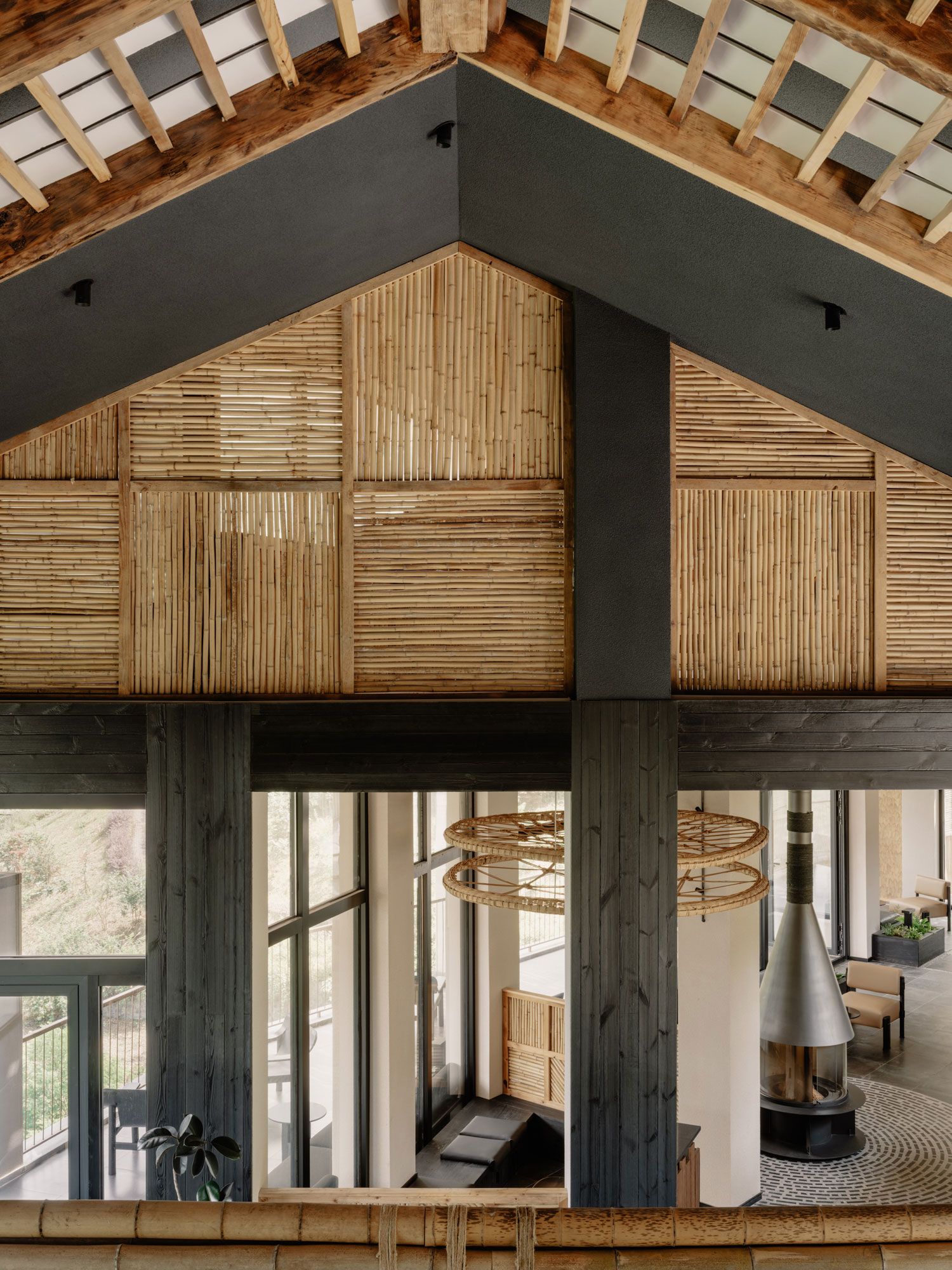 내부에 들어서면 바닥부터 천장까지 이어진 통창을 통해 웅장한 산세가 펼쳐진다. 인테리어는 창밖의 압도적인 풍경과 경쟁하려 하지 않는다. 대신 대나무, 목재, 검은 돌과 같은 현지 재료와 재활용 자재를 차분하게 조화시켜 풍경을 더욱 돋보이게 한다. 공용 공간인 최상층에서는 쪼개진 대나무 패널이 벽과 경사 천장을 감싸며 수직, 수평, 대각선의 다양한 패턴으로 공간에 리듬감을 부여한다. 현지 대나무 공예가와 협업하여 제작한 링과 디스크 형태의 조형물은 공간의 기하학적 선들을 부드럽게 중화시킨다.