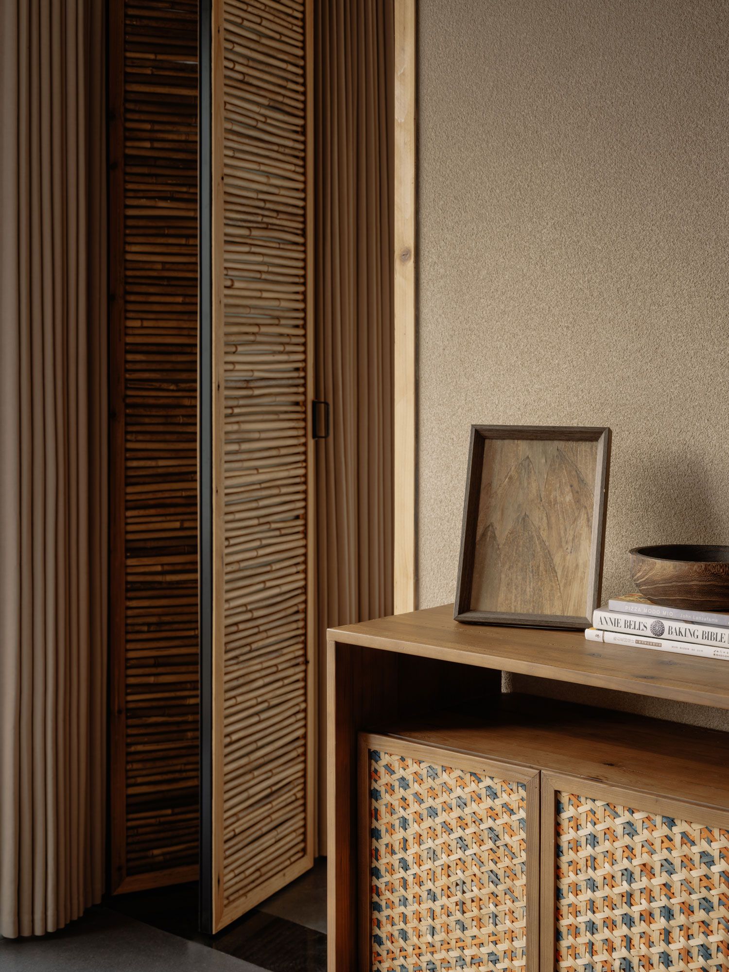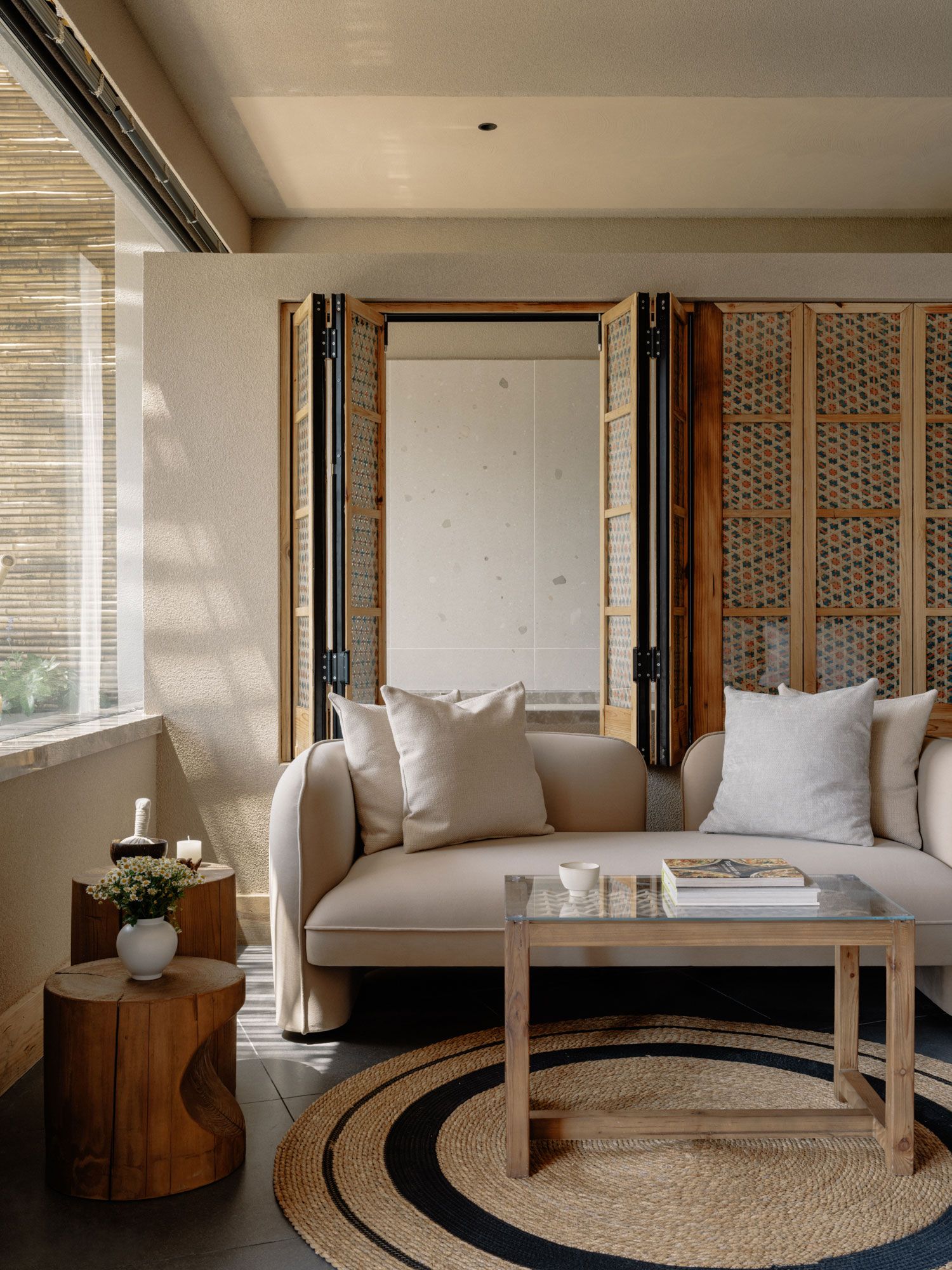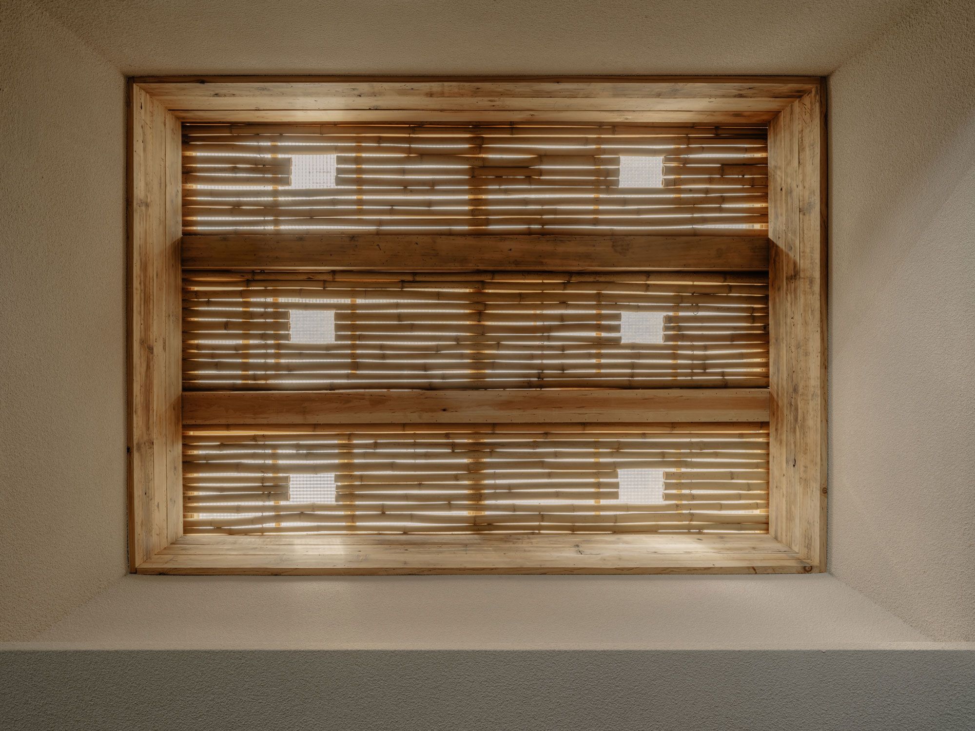 내부에 들어서면 바닥부터 천장까지 이어진 통창을 통해 웅장한 산세가 펼쳐진다. 인테리어는 창밖의 압도적인 풍경과 경쟁하려 하지 않는다. 대신 대나무, 목재, 검은 돌과 같은 현지 재료와 재활용 자재를 차분하게 조화시켜 풍경을 더욱 돋보이게 한다. 공용 공간인 최상층에서는 쪼개진 대나무 패널이 벽과 경사 천장을 감싸며 수직, 수평, 대각선의 다양한 패턴으로 공간에 리듬감을 부여한다. 현지 대나무 공예가와 협업하여 제작한 링과 디스크 형태의 조형물은 공간의 기하학적 선들을 부드럽게 중화시킨다.