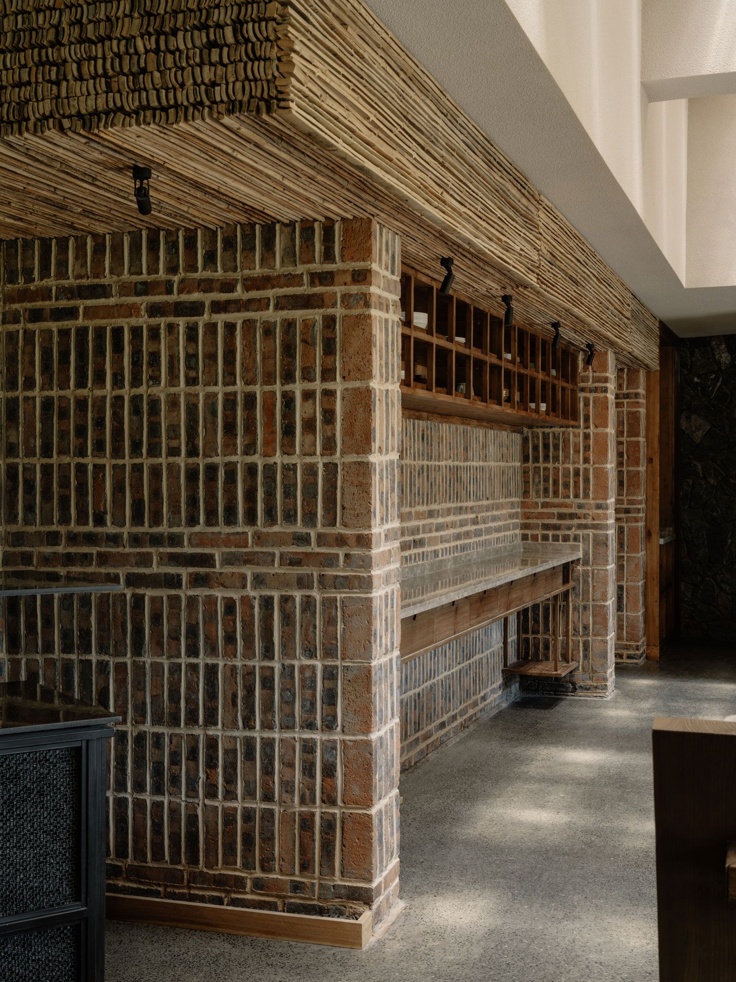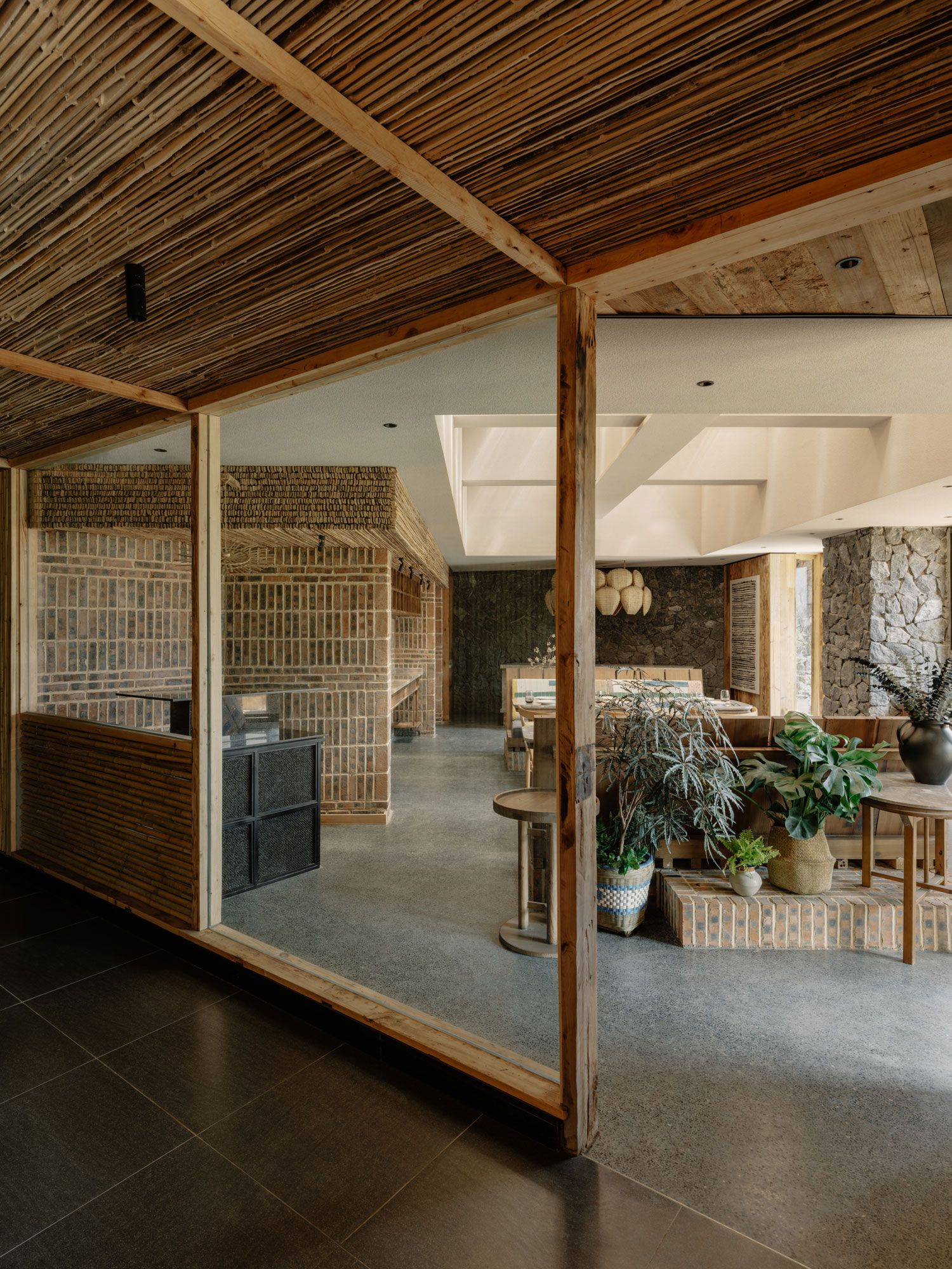 Occupying a ground floor annex created by extending the original parking area, the restaurant carries the vocabulary of reclamation into the dining environment. Red bricks removed during the building’s renovation were repurposed to build a textured wall separating the kitchen which is topped by a decorative bulkhead made from leftover bamboo scaffolding treads; offcut stones were used as wall cladding while locally collected rock and gravel is embedded in the terrazzo floors; even the cushions are sewn from reused fabrics. Despite this rich tapestry of textures, the space remains serene and pared-back thanks to simple, honest furniture and an otherwise restrained material palette. Daylight filtering through bamboo-lined skylights further enhances the warm, grounded atmosphere.