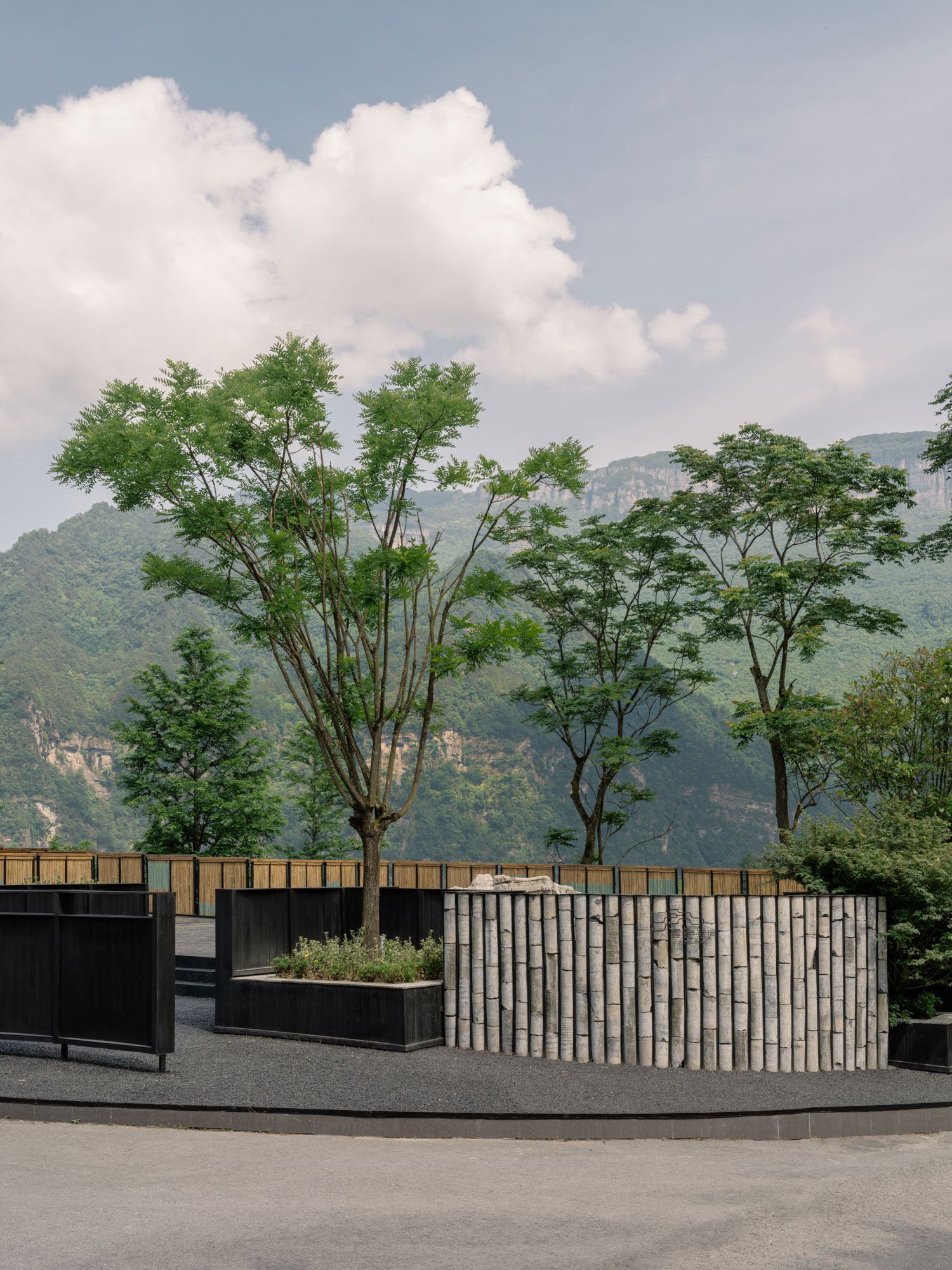 건축적으로는 다소 평범했던 기존의 5층 건물을 과감히 재구성하여 산과의 대화를 시도했다. 검은색 지역 암석으로 마감된 하층부는 건물을 대지에 단단히 고정하는 석조 기단의 역할을 하며, 그 위로 캔틸레버 형태의 백색 프레임이 수직으로 뻗어 나간다. 이는 가파른 산세와 시각적 조화를 이루는 동시에 객실 발코니의 윤곽을 형성한다. 수직 프레임 사이의 전면 유리창은 계곡의 파노라마 뷰를 내부로 가득 들여오며, 측면의 대나무 패널과 1층 객실의 프라이빗 중정을 구분하는 파티션은 차가운 물성에 따스한 질감을 더한다.