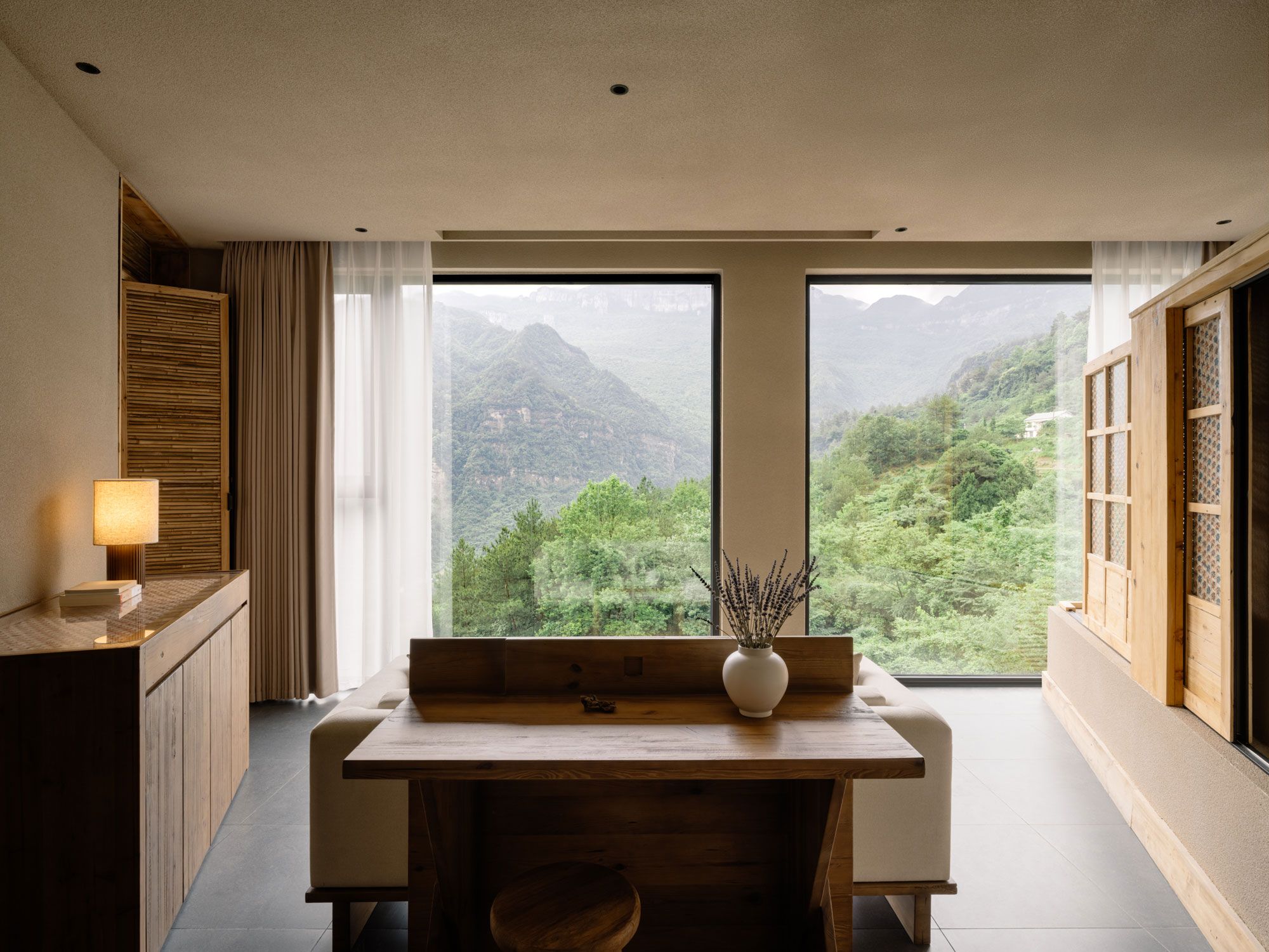 24개의 객실은 흙빛 톤과 천연 소재, 수공예 디테일을 조화롭게 사용하여 프로젝트의 철학을 일관되게 유지한다. 인근 난촨에서 생산된 가구들은 지역 경제에 기여할 뿐만 아니라 공간에 소박한 통일성을 부여한다. 투숙객은 장식적인 요소보다는 창밖으로 펼쳐지는 막힘없는 산의 풍경에 온전히 집중하게 된다.