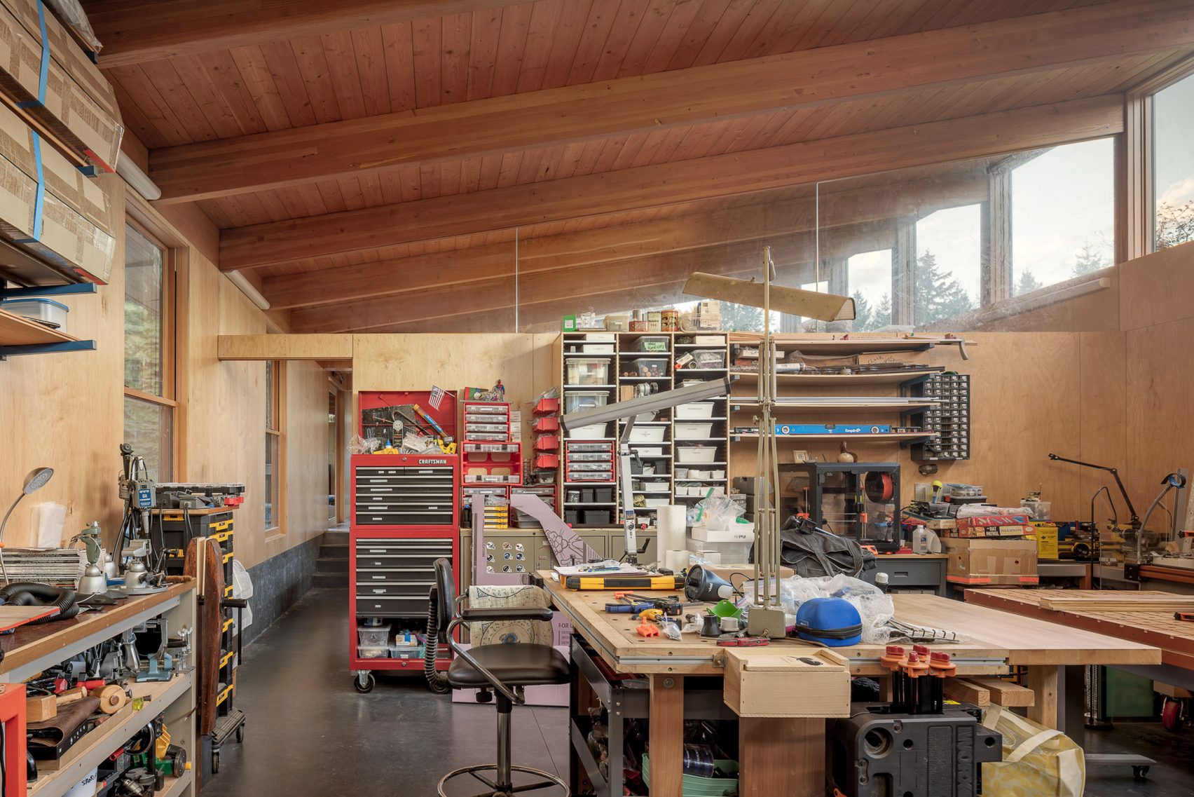 Known as the French Creek Workshops House, the 2,471-square-foot (230 square metre) residence is complemented by a 1,471-square-foot (137-square metre) workshop that has space for waving, glass blowing, furniture making and other artistic pursuits.