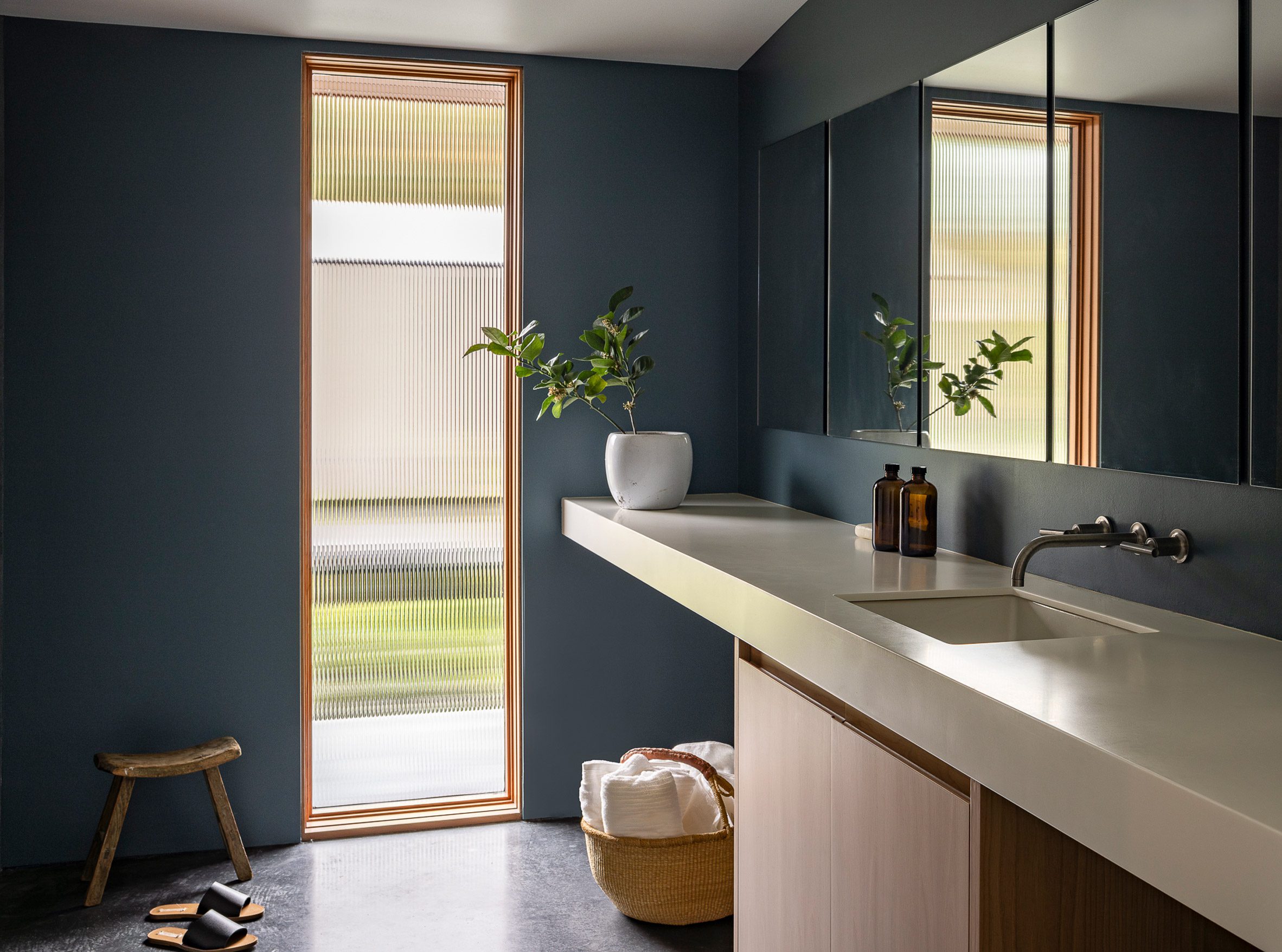바닥은 온수 복사 난방을 적용한 현장 타설 콘크리트로 마감해 따뜻함과 실용성을 모두 잡았습니다. 여기에 지역산 전나무와 삼나무, 테라조 소재를 더해 자칫 차가워 보일 수 있는 콘크리트 물성을 중화시켰습니다. 특히 붉은 갈색의 처마 밑면(Soffit)과 선명한 파란색 주방 벽면은 차분한 공간에 생동감을 불어넣습니다. 거주자가 직접 짠 목재 스크린 사이로 스며드는 빛은 실내를 더욱 은은하게 만듭니다.
