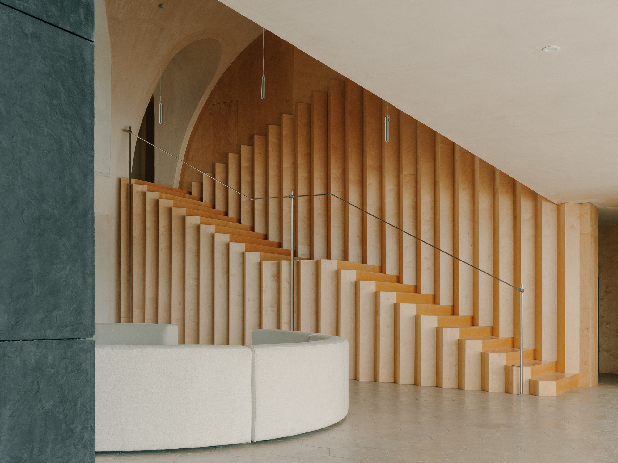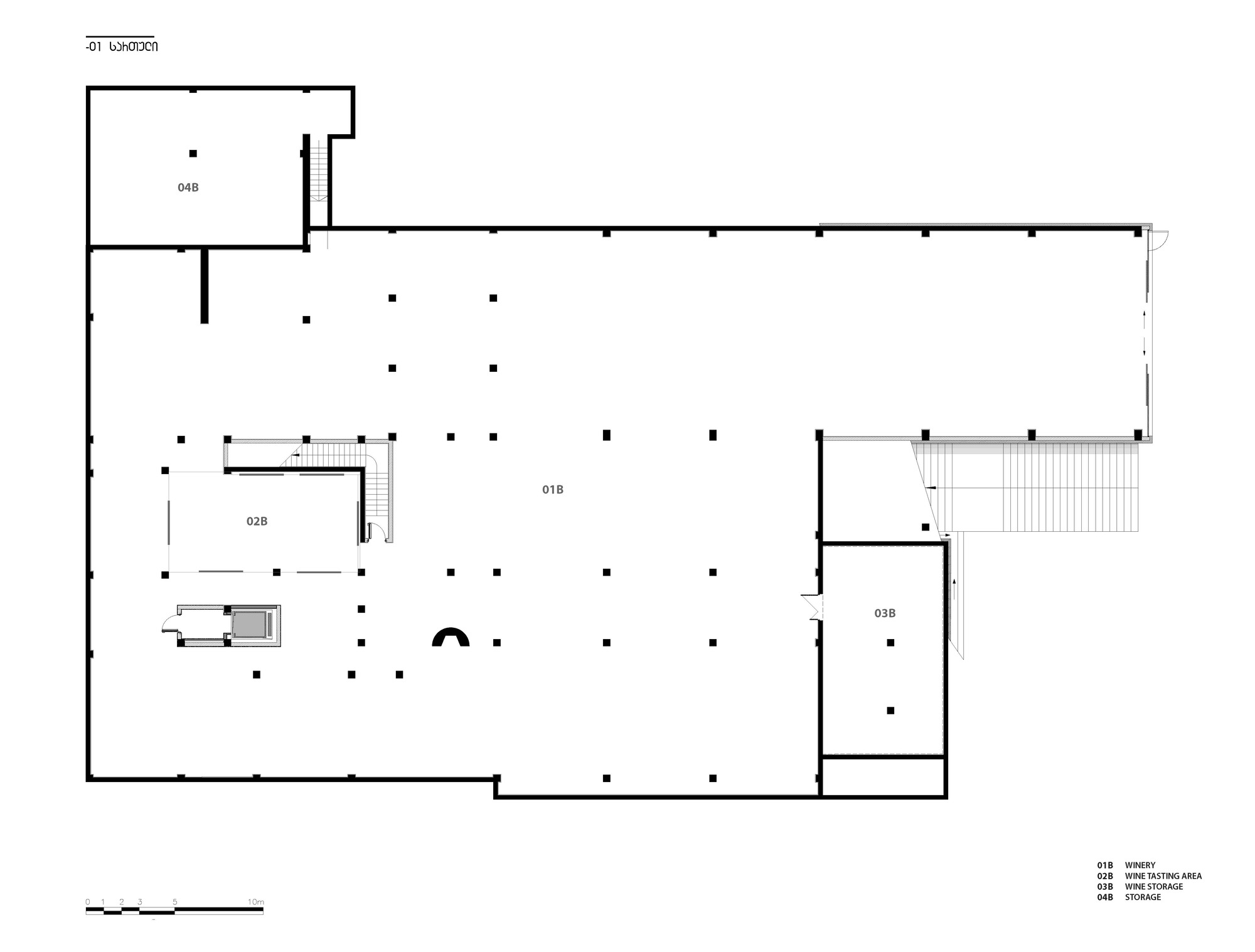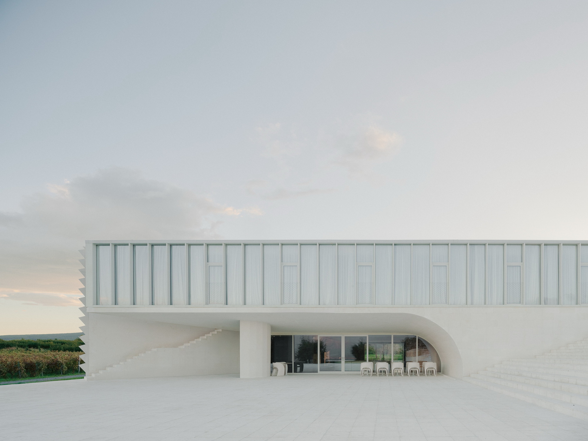 기능적으로 이곳은 와이너리인 동시에 소규모 호텔, 리셉션, 컨퍼런스 공간, 그리고 레스토랑을 아우르는 복합 공간이다. 건물은 코카서스 산맥을 향해 북쪽으로 열려 있으며, 그곳에서 시작된 웅장한 계단은 포도밭과 생산 시설이 있는 아래쪽 대지로 뻗어 내려간다. 거대한 설비가 필요한 생산 구역은 경사지형의 틈새로 교묘히 숨겨져 있어, 겉보기에 이 건물은 공장이 아니라 가내 수공업 규모의 소박하고 독립된 저택처럼 다가온다.