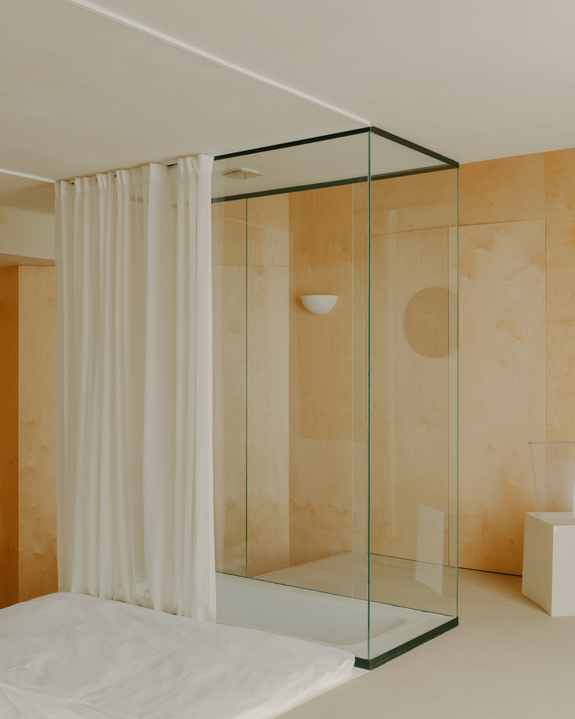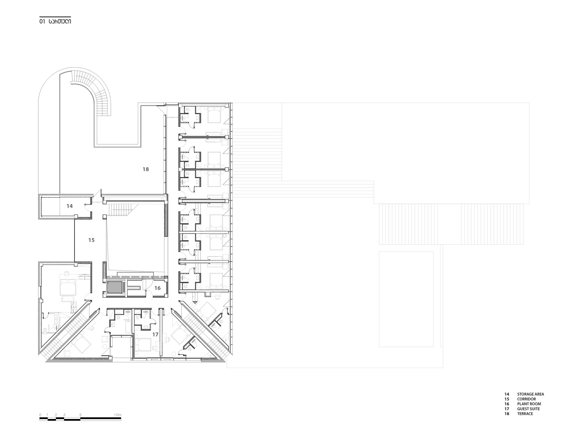 The second central element of this space is the staircase, which attempts to resemble an organ; however, its particle-formed geometry represents a continuation of a similar theme found on the building's eastern facade. The interior is monochrome, though composed of several elements, such as the matched textures of wood and plaster. Additionally, the inclusion of small colored inserts, which determine the muted coloration, is dictated by the Georgian fresco tradition. In the hotel rooms, a boudoir atmosphere formed by drapery is notable.