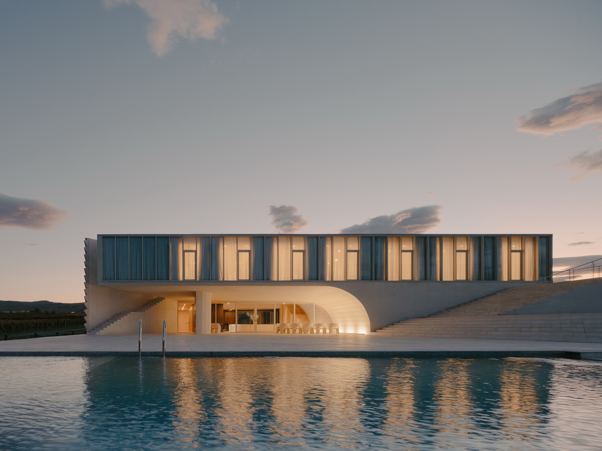 건물은 전면에 배치된 저수지를 정면으로 마주한다. 시각적으로 이 구조물은 마치 하나의 재료로 빚어지거나 거대한 바위를 깎아 만든 단일체(Monolith)처럼 보인다. 그러나 측면으로 시선을 옮기면 건축적 테마에 따라 매스가 엄격하게 분할되어 있으며, 날카로운 '쉼표'와 같은 간극과 짙은 그림자가 그 경계를 명확히 짓는다. 건물의 조형은 조각적인 매스 덩어리와 이를 관통하는 아치형 보이드(Arched voids)의 교차로 완성된다. 이곳은 역사적인 구축법과 현대적인 구조 미학이 만나는 접점이다. 건축의 성격은 철저히 '대립적 요소(Antagonists)의 균형' 위에 기초한다. 구조물은 대지에 굳건히 뿌리박고 있는 육중함을 가지면서도, 동시에 허공에 떠 있는 듯한 가벼운 부유감을 선사한다.