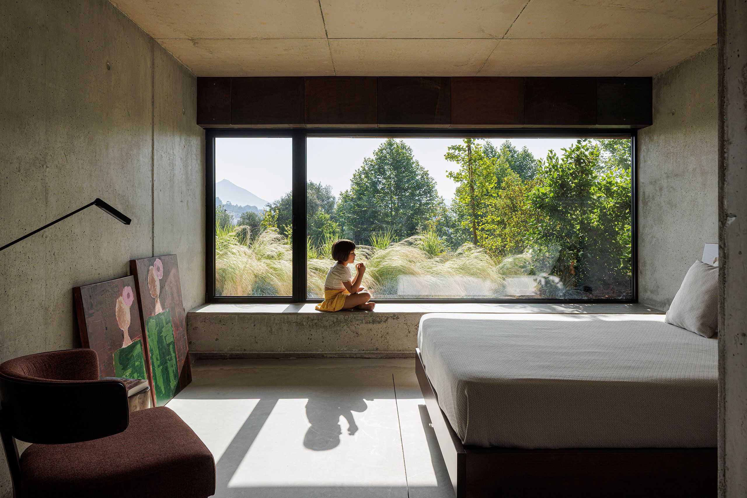 아래쪽 비탈을 향해 열린 침실들은 벽면을 가득 채운 통창을 통해 풍경을 내부로 깊숙이 끌어들입니다. 창밖의 수풀과 식재들은 시선을 부드럽게 걸러주는 필터가 되어, 다소 아담할 수 있는 방에 깊이감과 탁 트인 개방감을 불어넣습니다.