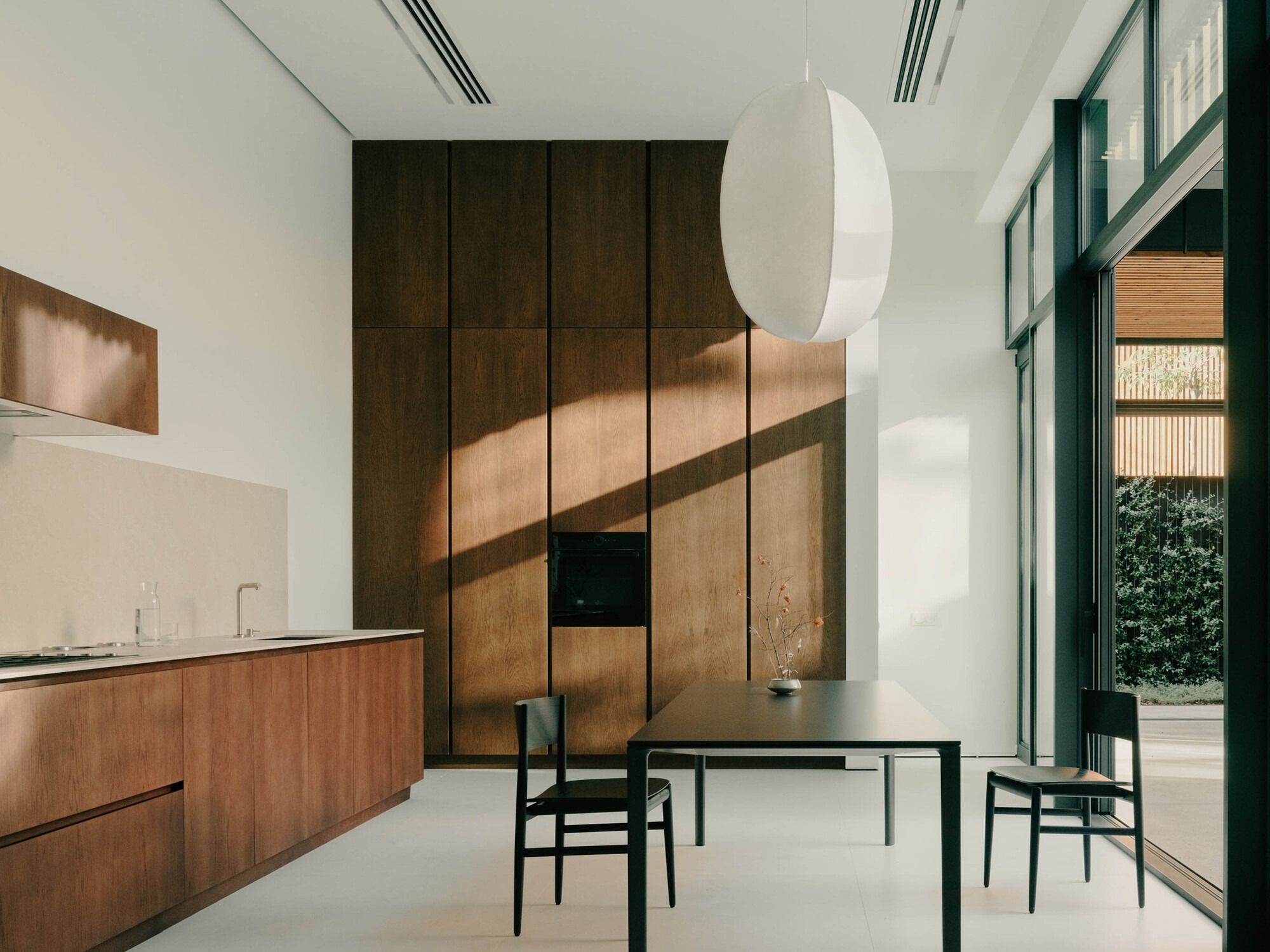 재료의 사용은 이 집의 '반전 논리'를 더욱 극적으로 보여준다. 도로와 마주한 외관은 **'탄화목(Charred wood)'**으로 마감했다. 목재 표면을 불에 태워 내구성을 높이는 이 전통 기법은, 숯처럼 검고 거친 질감으로 집을 보호하는 단단한 껍질 역할을 한다. 그러나 중정으로 들어서는 순간, 검은 껍질은 사라지고 가공되지 않은 천연 목재가 등장해 따뜻함을 전한다. 더 깊숙한 내부 공간은 순백색으로 마감해, 빛과 비례 그리고 공간감 그 자체가 주인공이 되게 했다. '탄화목 → 천연 목재 → 추상적인 백색'으로 이어지는 이 흐름은, 거친 외부에서 내밀한 중심으로 진입할수록 물성이 점차 사라지는 '비물질화(Dematerialization)'의 경험을 완성한다.