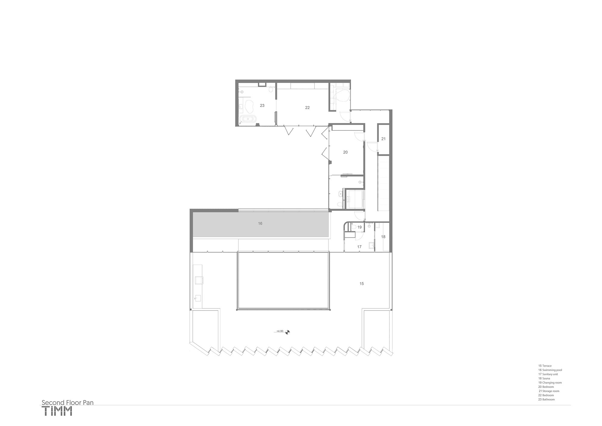 현관, 거실, 주방 등 주요 생활 공간은 모두 내부 중정을 향해 열려 있어, 중정을 마치 '지붕 없는 거실'처럼 확장한다. 이 빈 공간(Void)을 가로지르며 허공에 띄워진 수영장은 하부에 아늑한 그늘을 드리우고, 시각적으로 상부 층을 연결하는 매개체가 된다. 단면을 살펴보면, 건물은 뒤쪽에서 3층 높이로 솟아오르지만 도로 쪽에서는 단층으로 보여 위압감을 덜어냈다. 이러한 높이 차이는 2개 층 높이의 시원한 층고와 스킵 플로어(Skip-floor) 구조를 만들어내며, 점진적이고 유연한 공간 경험을 선사한다.