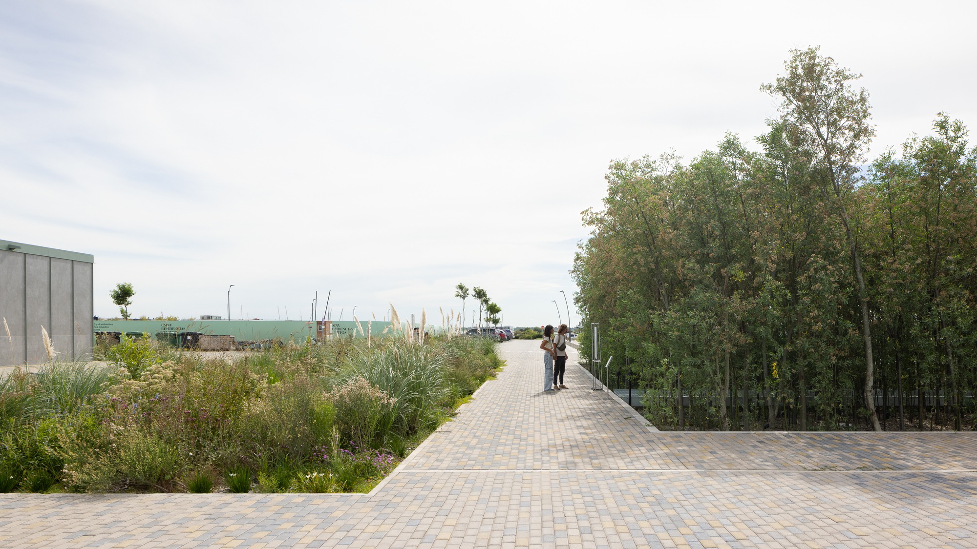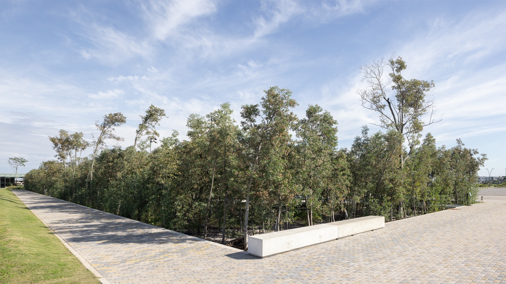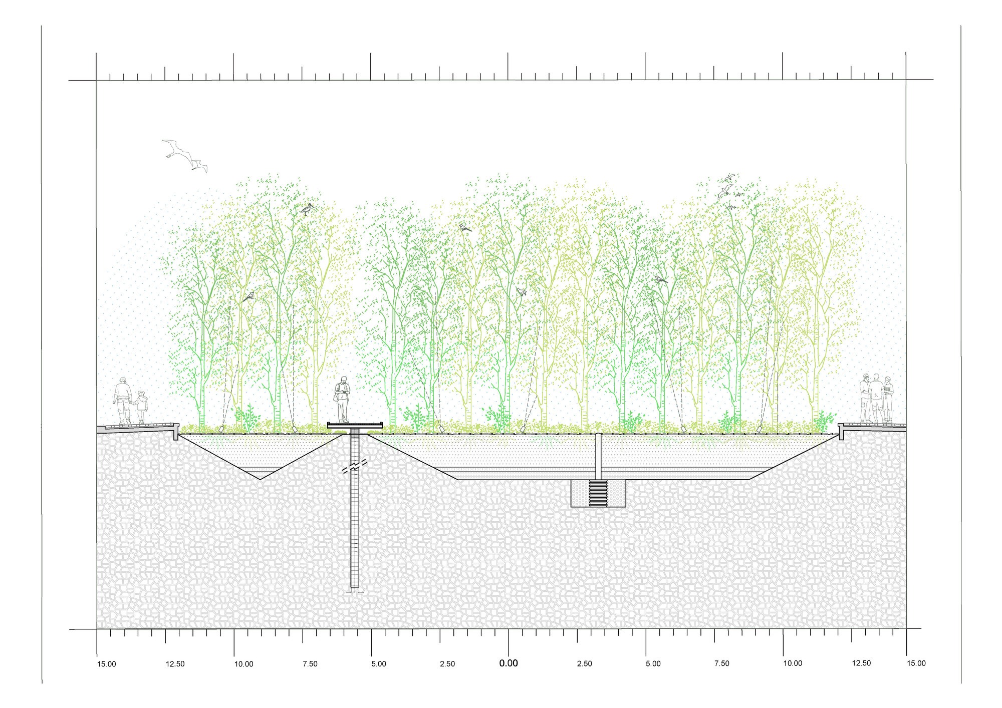 The Forest is defined as both a hydraulic and ecological infrastructure. A large vessel of seven thousand five hundred cubic meters of a soil specifically designed to emulate conditions of flooding, water flow, and salinity, in which this species lives and develops. An infrastructure that fills and empties with water simulating the pulsations of origin, through irrigation and drainage pumps. This new highly technical soil protects the alder from the nearby salty water table. This grove of two thousand two hundred specimens of local genetics and no commercial value functions as the first artificial alder grove: a displaced species that returns to its place of origin, regenerating part of the original matrix of the site. A systemic and dense planting was designed, combining specimens of various age ranges to accompany the original social composition of these botanical populations.