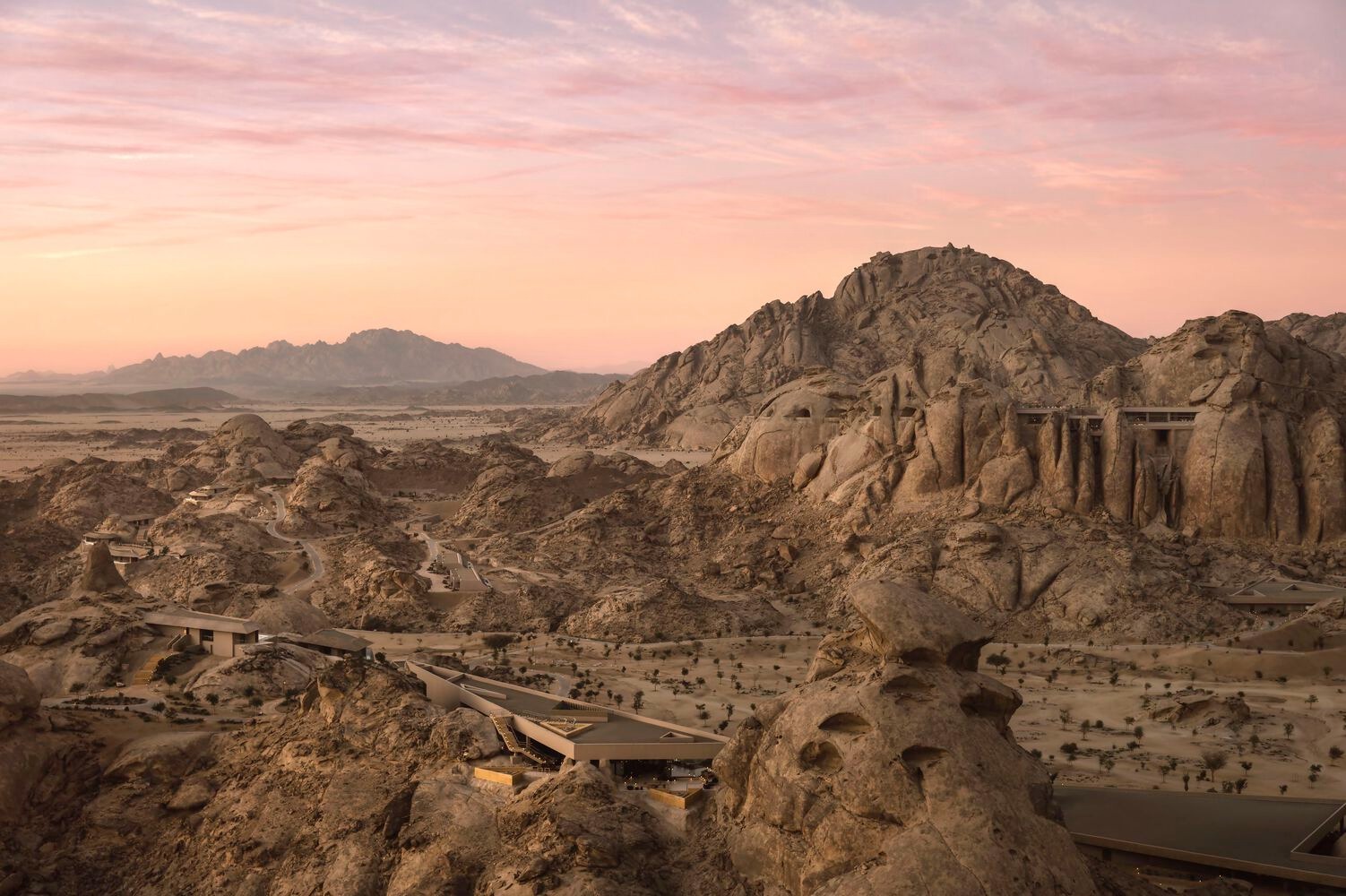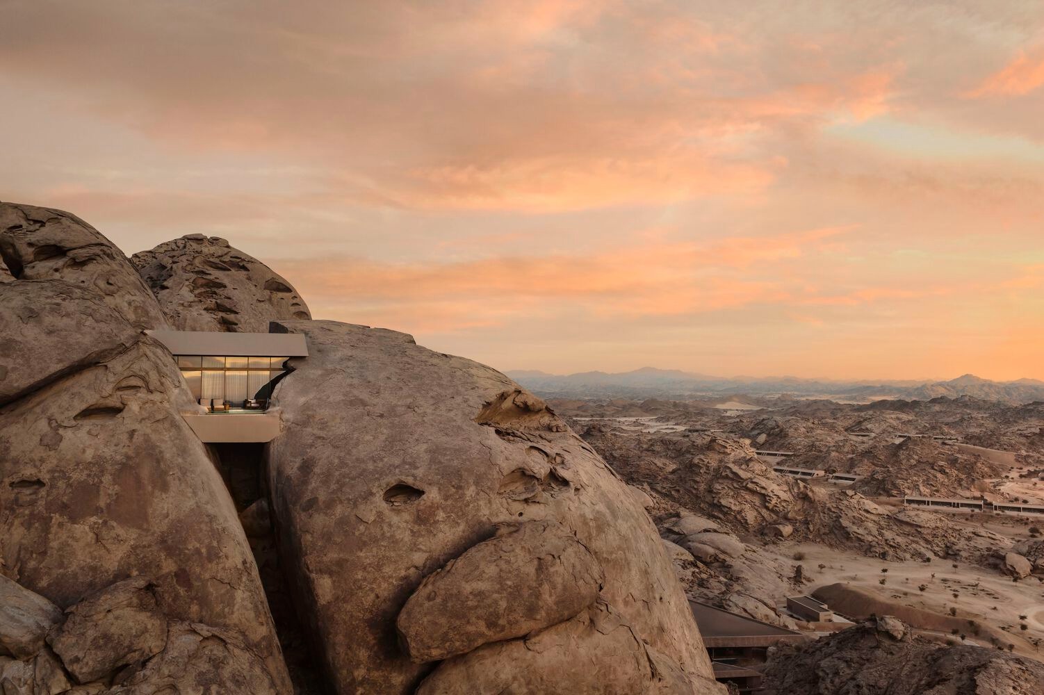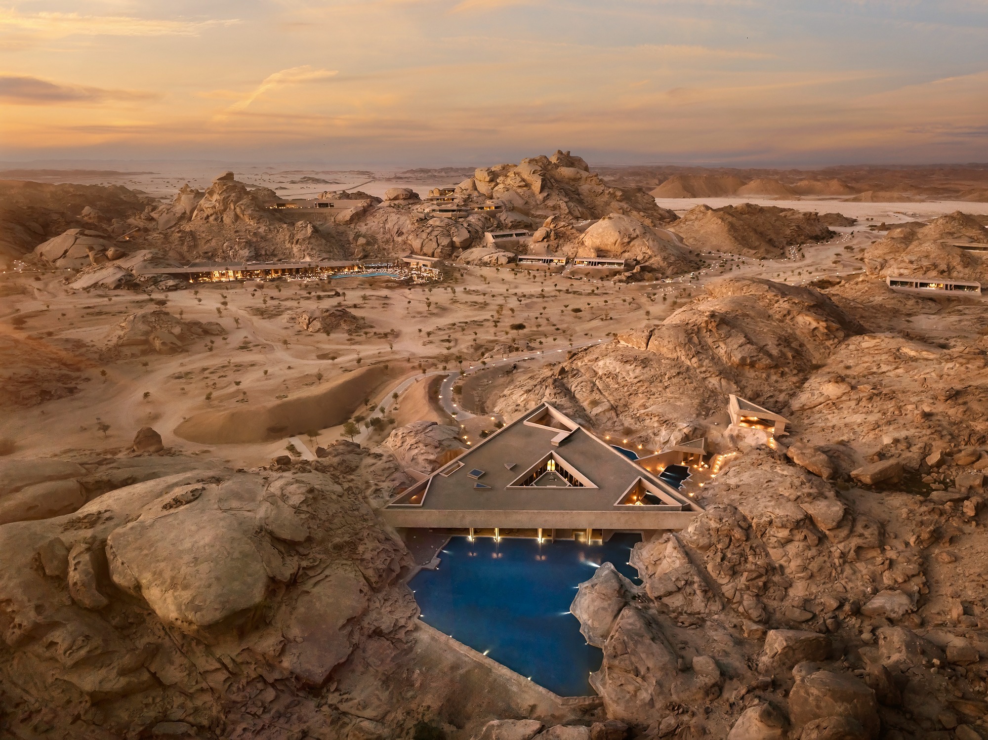 Upon arrival, visitors enter a concealed valley that gradually unveils a collection of facilities set within 30,000 square meters of land. The resort's accommodations range from ground level villas to suites embedded within the mountains, each designed to maximize natural light, uninterrupted views, and a tactile connection to the desert.