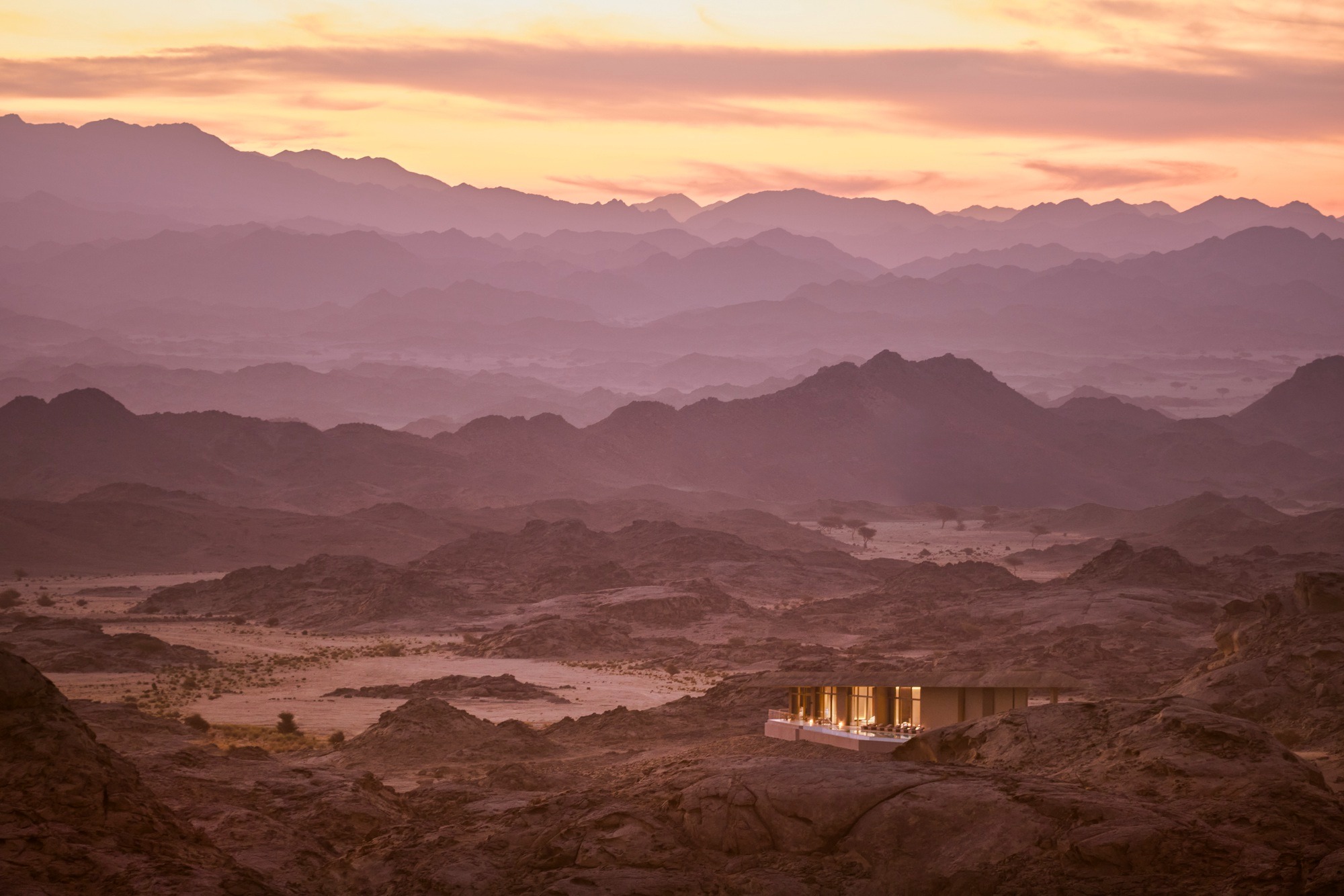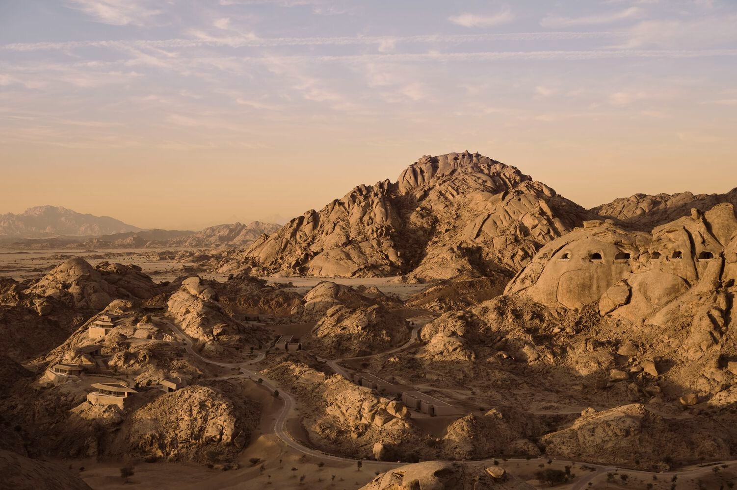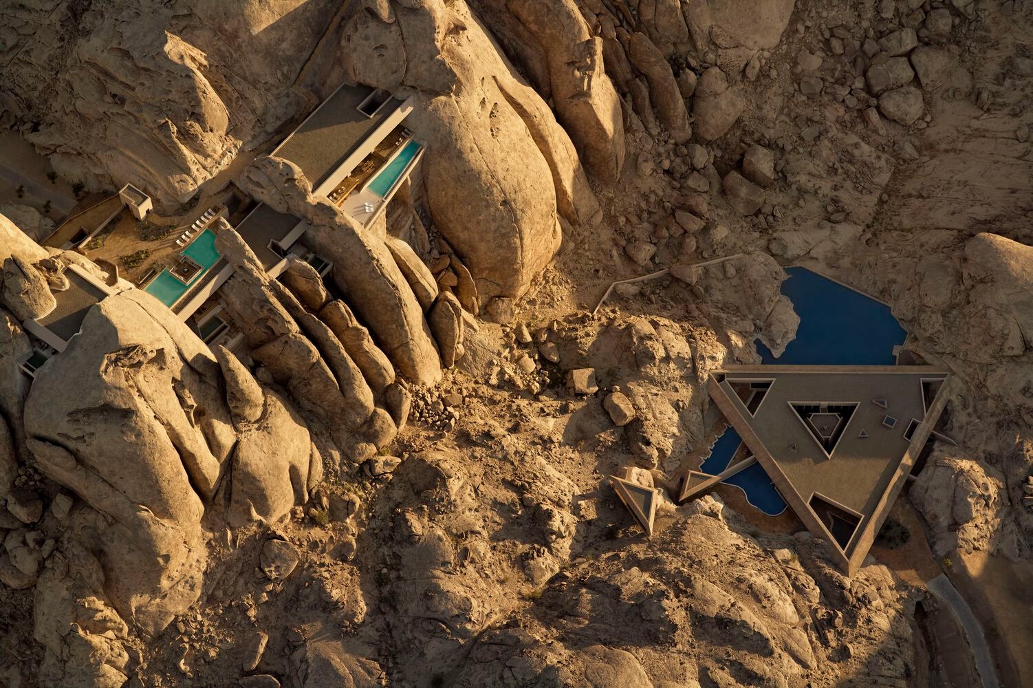 Upon arrival, visitors enter a concealed valley that gradually unveils a collection of facilities set within 30,000 square meters of land. The resort's accommodations range from ground level villas to suites embedded within the mountains, each designed to maximize natural light, uninterrupted views, and a tactile connection to the desert.