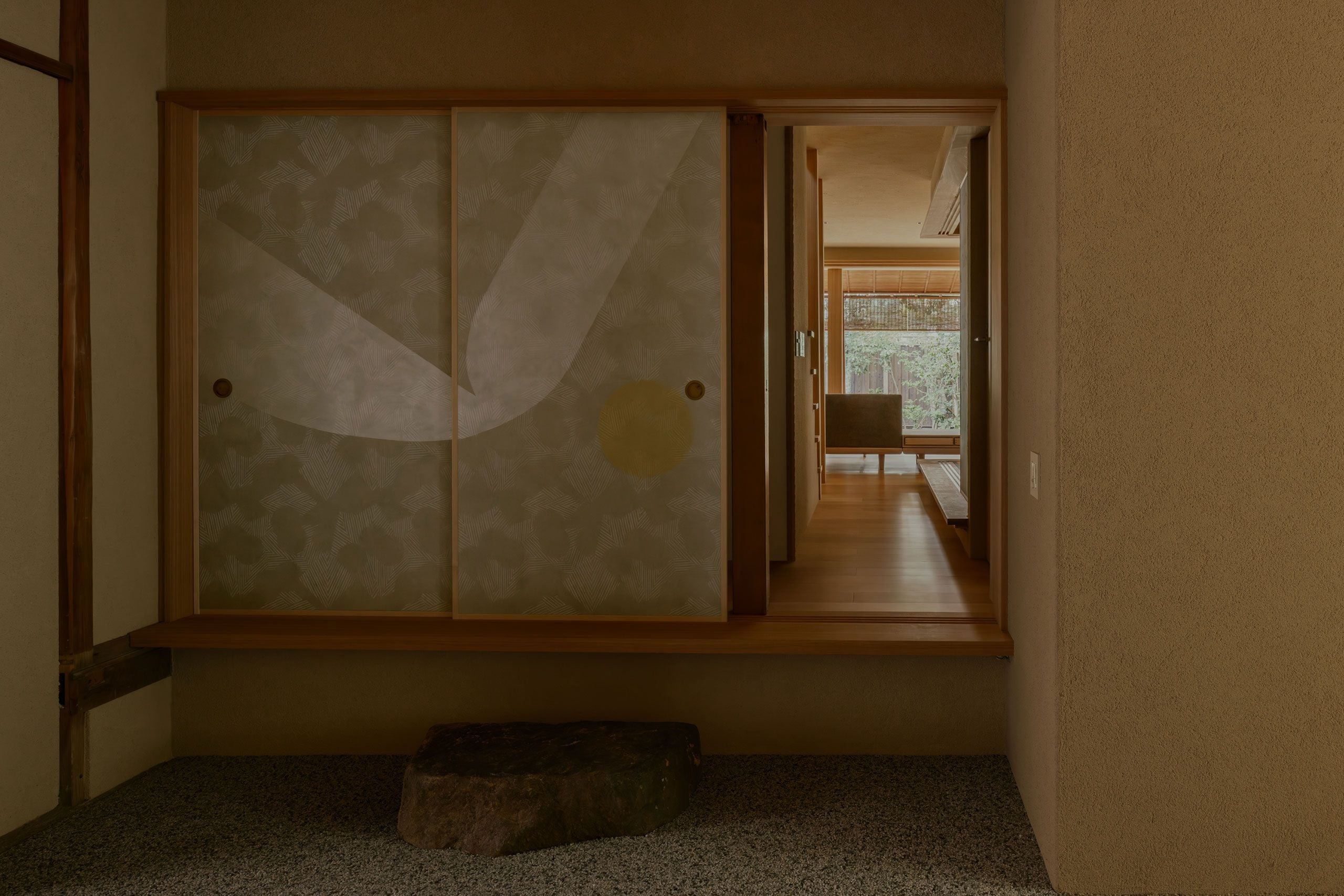 The reconfiguration of the main house begins with the doma, an earthen floored passage that bisects the ground floor, linking the stone-paved entrance at the front to the landscaped garden at the rear. More than a corridor, it functions as a spatial hinge, separating everyday living areas from spaces intended for formal entertaining, while also operating as an atmospheric threshold. Washed aggregate underfoot extends seamlessly from the exterior approach, blurring the boundary between arrival and interior, while fusuma sliding panels featuring abstract geometric compositions by Noda Print Studio, acclaimed for their modern use of karakami hand-printing techniques, imbue the space with a muted graphic rhythm.