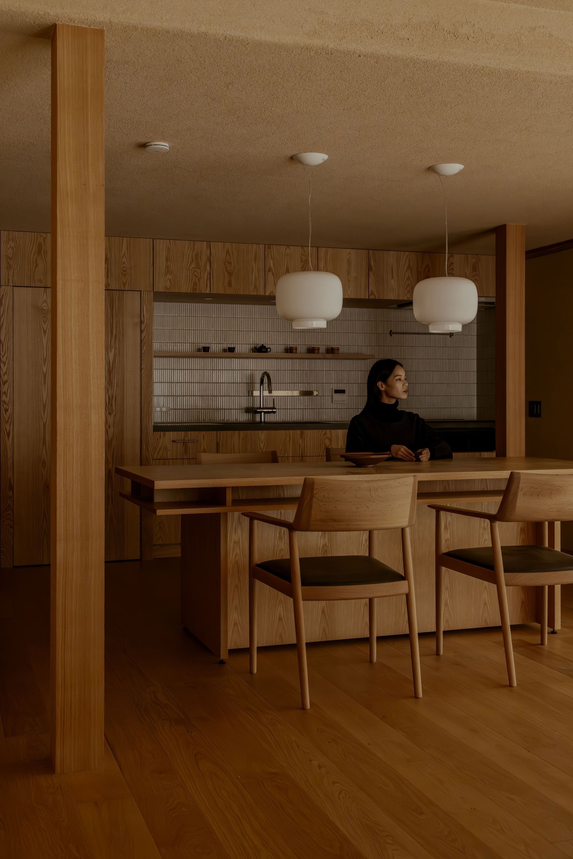 집안 곳곳에는 깊은 처마와 전통 창호를 거친 맑은 빛이 내려앉는다. 이 빛은 마감재가 품은 차분한 표정을 가만히 어루만진다. 쥬라쿠 흙벽은 부드럽고 깊이 있는 질감으로 공간에 빛을 골고루 흩뿌린다. 단풍나무 마루와 굵직한 목재 기둥, 나뭇결이 살아있는 가구들은 따뜻한 색감을 조화롭게 더해준다. 이 자연 소재들은 그저 풍경을 액자처럼 담아내는 데 그치지 않는다. 바깥의 자연을 실내로 끌어들여 조용히 교감하는 아늑한 분위기를 빚어낸다.