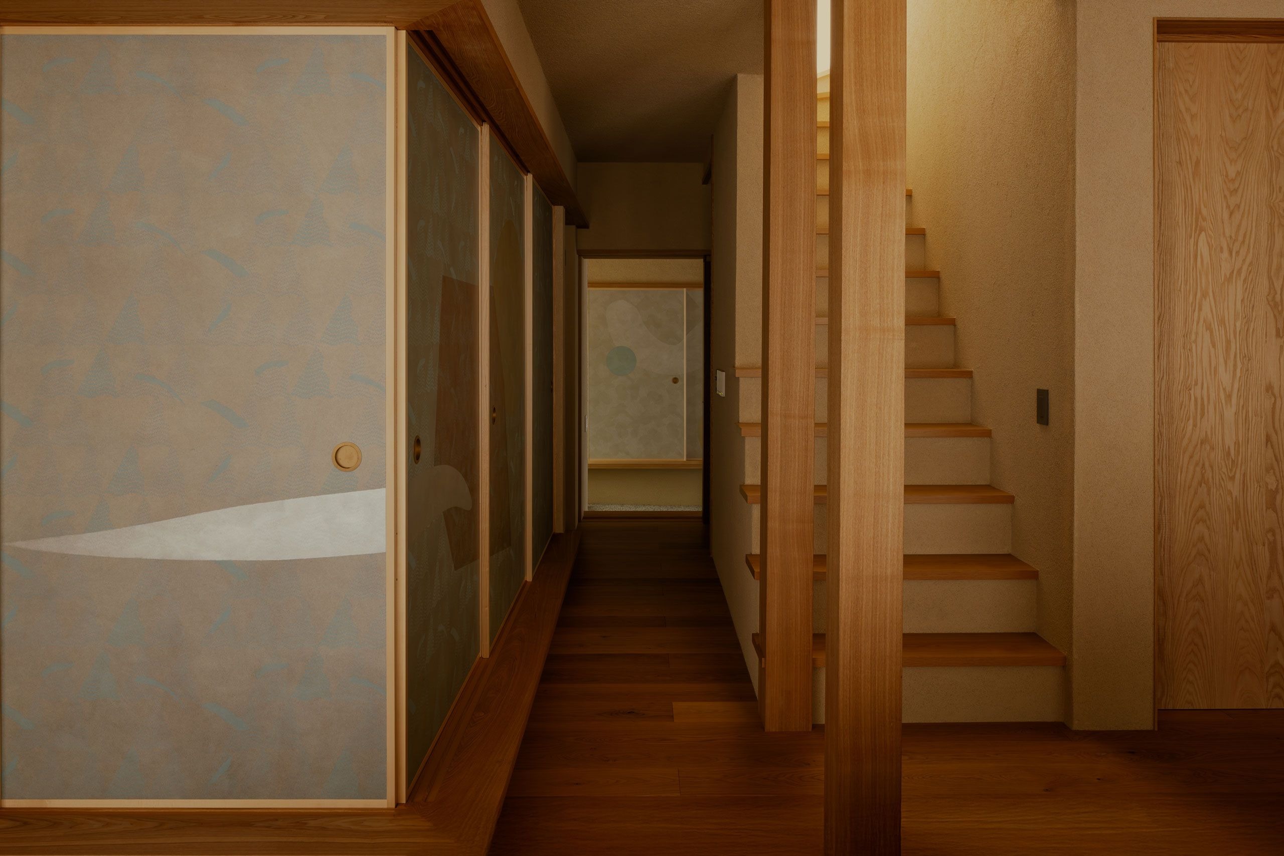 본채 1층을 가로지르는 흙바닥 통로, 즉 도마에서 진정한 공간의 변화가 시작된다. 전면의 돌길과 후면의 정원을 잇는 이곳은 단순한 복도가 아니다. 일상 공간과 손님을 맞는 공간을 구분하는 든든한 축이자, 외부에서 내부로 들어설 때 분위기를 바꿔주는 감각적인 경계선이다. 발밑에 깔린 골재 바닥은 바깥 길에서 실내로 매끄럽게 이어져 안팎의 경계를 흐릿하게 만든다. 여기에 더해진 기하학 무늬의 맹장지는 공간에 차분한 리듬감을 부여한다. 이는 수제 인쇄 기법을 현대적으로 풀어낸 노다 프린트 스튜디오의 작품이다.