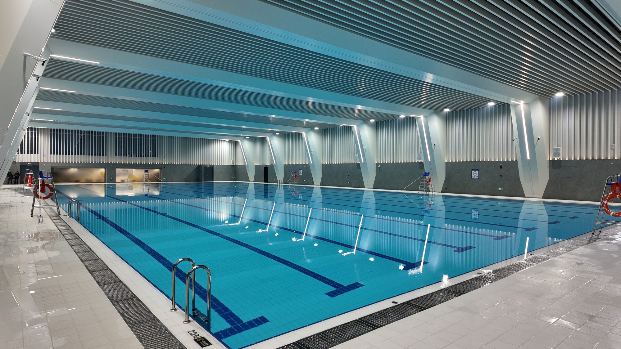 Beyond office use, the podium incorporates a 5,000-square meter Community Cultural Center that is fully operational and open to the public. The facility includes a library, multipurpose cultural spaces, professional-grade sports halls, and an Olympic-sized swimming pool. Triple-height sky atriums punctuate the towers, fostering vertical connectivity and introducing natural light deep into the workplace environment.