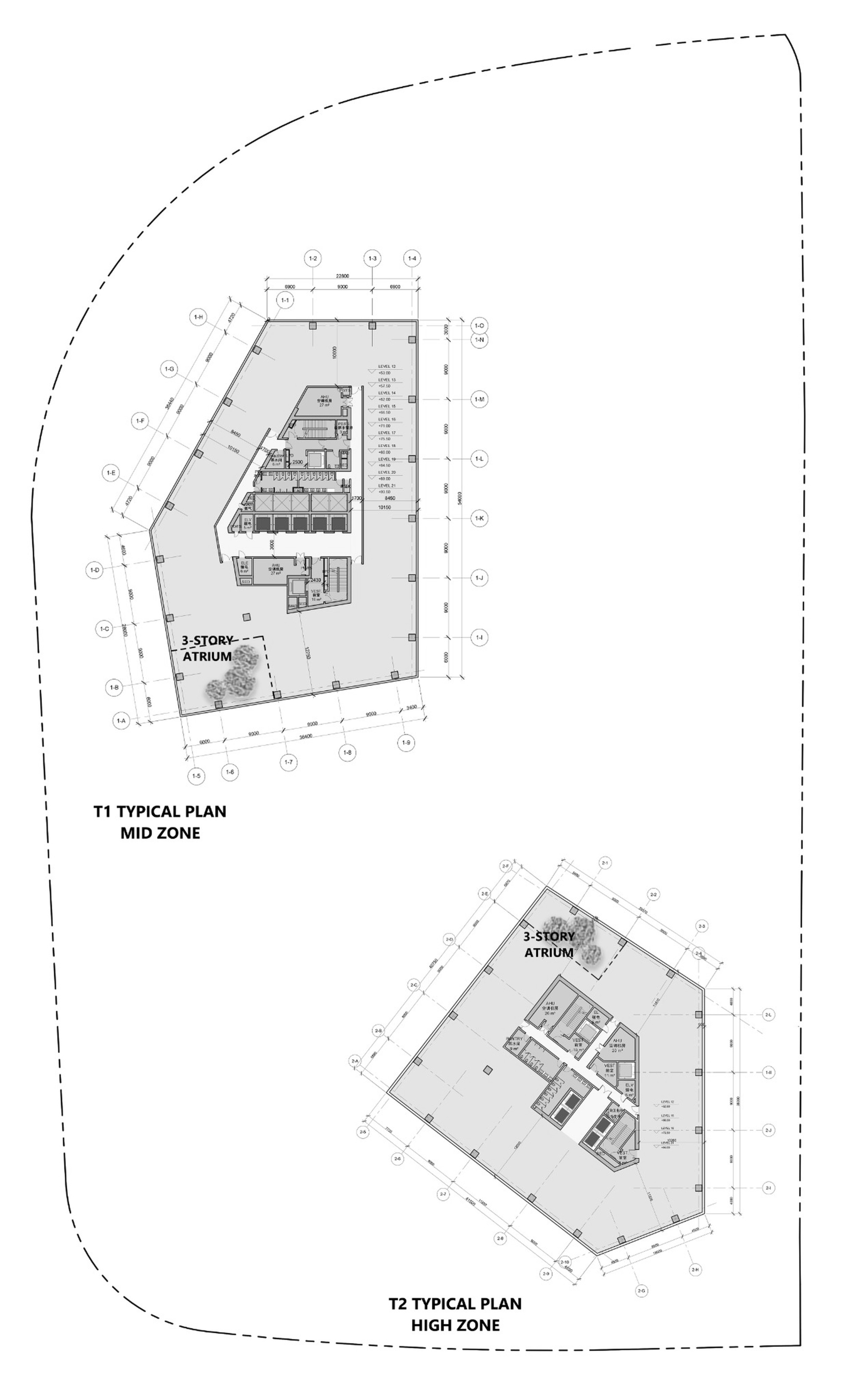 설계팀은 대지 중앙에 거대한 타워 하나를 우뚝 세우는 전통적인 방식을 버렸습니다. 대신 두 개의 오피스 건물을 부지 가장자리로 밀어냈습니다. 그 결과 중심부에 삼천 제곱미터 규모의 널찍한 공공 광장이 생겨났습니다. 이러한 분산형 매스 계획은 삭막한 비즈니스 지구 내에 숨통을 틔우는 다공성의 도시 거실을 만들어냅니다. 주변 블록으로 이어지는 보행자의 발걸음도 광장을 통해 자연스럽게 이어집니다.