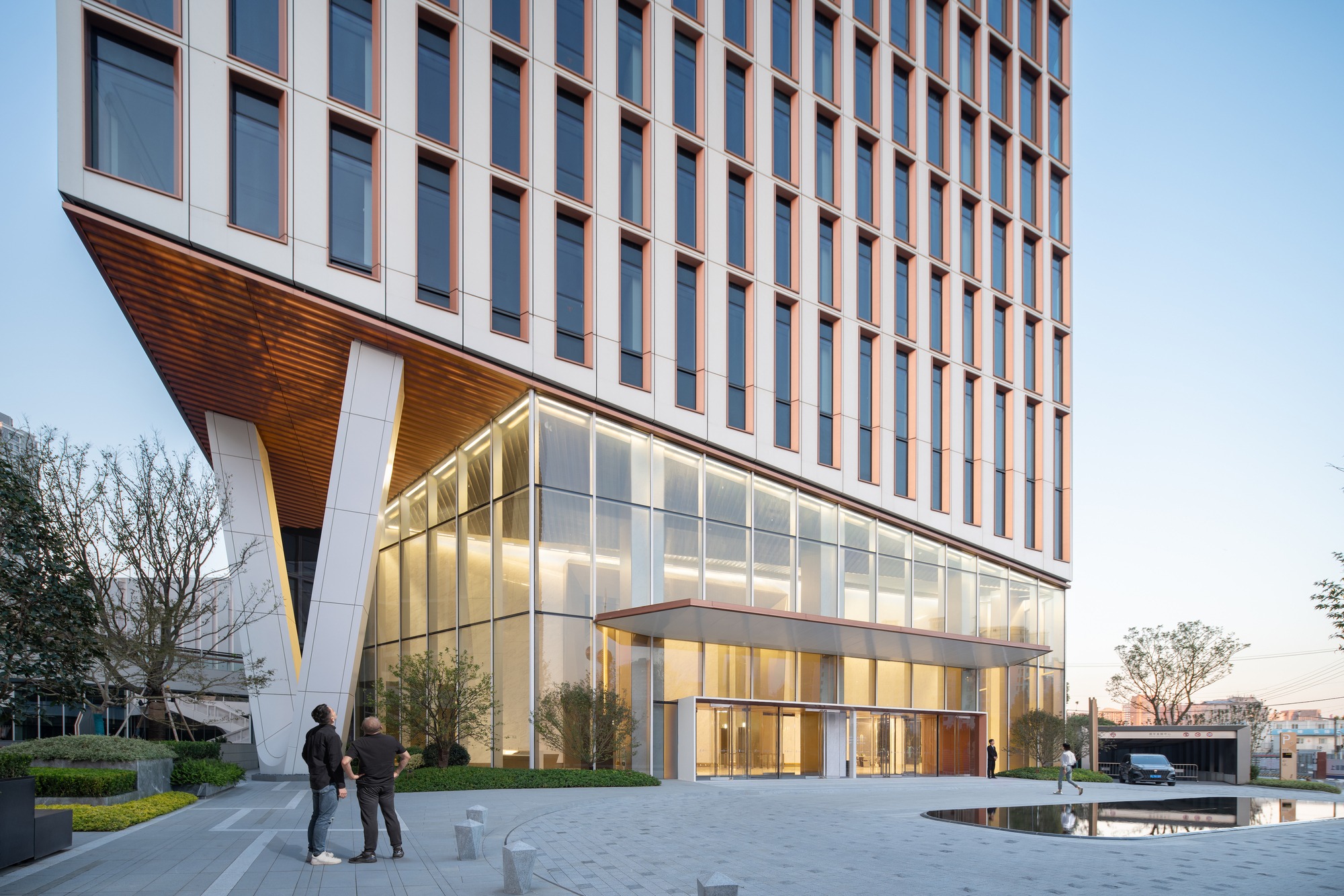 Terracotta toned aluminum profiles abstract the masonry textures of Shanghai's historic districts, replacing anonymous reflective glazing with a warmer, contextually grounded identity. The unitized curtain wall integrates concealed floor-level ventilation modules, enabling mixed-mode operation across a majority of occupied spaces and supporting LEED Gold, WELL, BREEAM, and China Three-Star Green Building certification targets.