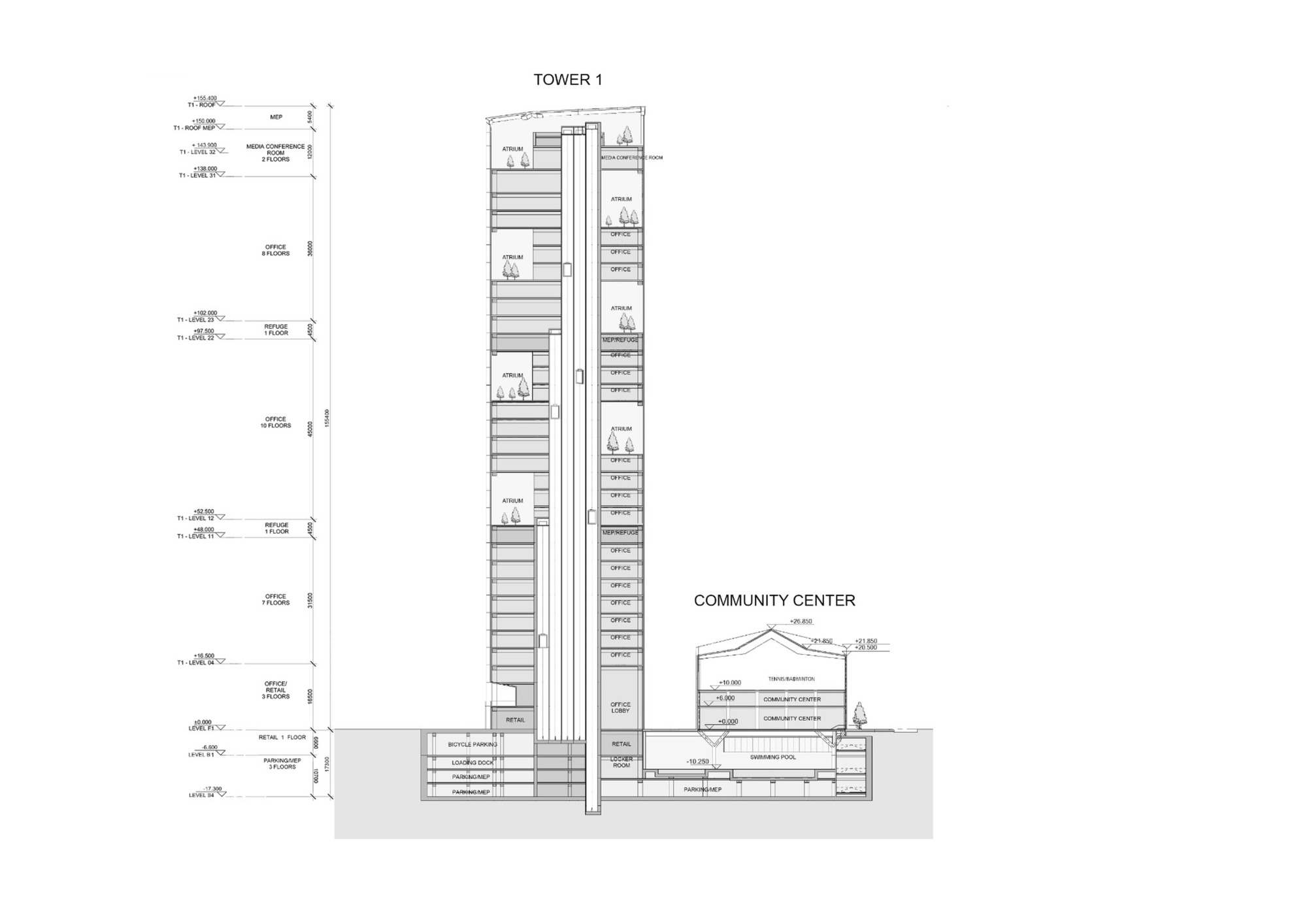 이 건물은 상업적 업무 시설의 한계에 머물지 않습니다. 건물의 기단부에는 오천 제곱미터 규모의 커뮤니티 문화 센터가 자리하여 시민들에게 활짝 열려 있습니다. 이곳에는 도서관과 다목적 문화 공간은 물론, 전문가 수준의 스포츠 홀과 올림픽 규격의 수영장까지 갖춰져 있습니다. 또한 타워 곳곳을 수직으로 시원하게 뚫어낸 스카이 아트리움은 단절되기 쉬운 고층 건물의 층과 층을 이어주고, 공간 깊은 곳까지 생동감 있는 빛을 쏟아냅니다.