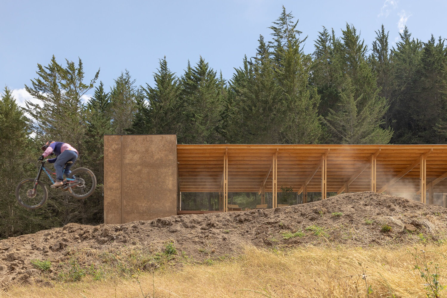 The design is defined by a simple volumetric gesture, consisting of two solid volumes of pigmented concrete that emerge from the earth and delineate the interior space, and a lightweight wooden roof that projects over the terrain like a lookout point, framing the horizon, the forest, and the movement of cyclists.