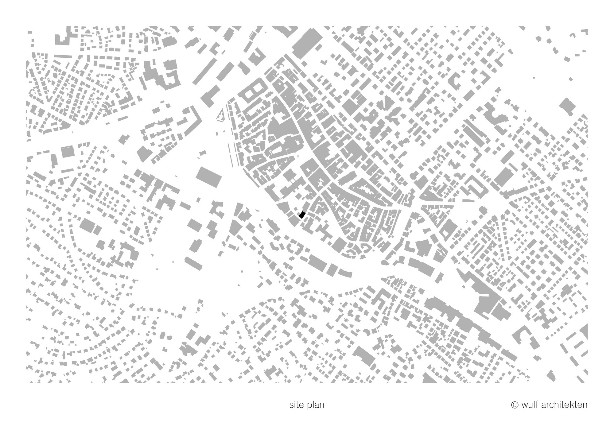 The new building's outward appearance is restrained. The internal structure consists of wooden trusswork that braces the adjoining row of houses and reestablishes the lost form of the historic house. The new building facilitates barrier-free access to the old buildings and provides space for small events. The roof and facades are clad with a homogeneous layer of cast-glass "beaver-tail" tiles.