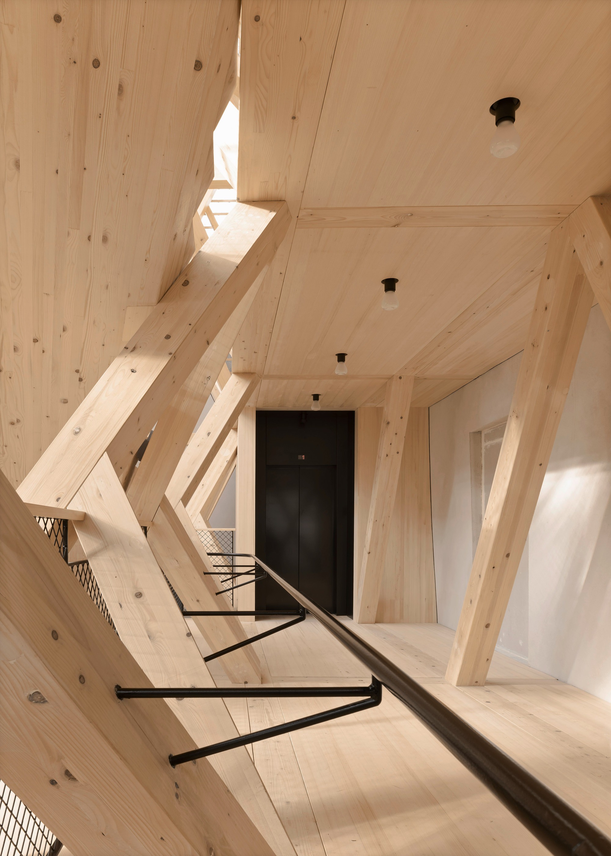 이번 재생 프로젝트는 엄격한 보존 기준을 따랐습니다. 과거 석조 저택이 있던 모퉁이에 새로운 건물을 세웠고, 이 신축 건물이 곁에 있는 위태로운 옛 가옥들을 무너지지 않게 단단히 지탱해 줍니다. 이제 낡은 옛집들은 그 자체로 700년의 도시와 건축의 역사를 증명하는 훌륭한 박물관이 되었습니다. 겉에서 바라본 새 건물의 모습은 차분하고 절제되어 있습니다. 하지만 주조 유리 비버테일 기와가 단정하게 덮인 외피 너머로는 거대한 목조 트러스 구조가 뼈대처럼 자리 잡고 있습니다. 이 뼈대가 잃어버린 과거의 형태를 되살리는 동시에 옛집을 지켜냅니다. 또한, 누구나 쉽게 지나다닐 수 있는 무장애 동선을 내어주고, 사람들이 모여 작은 행사를 열 수 있는 여백의 공간까지 마련해 줍니다.