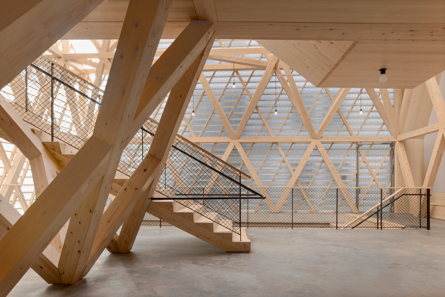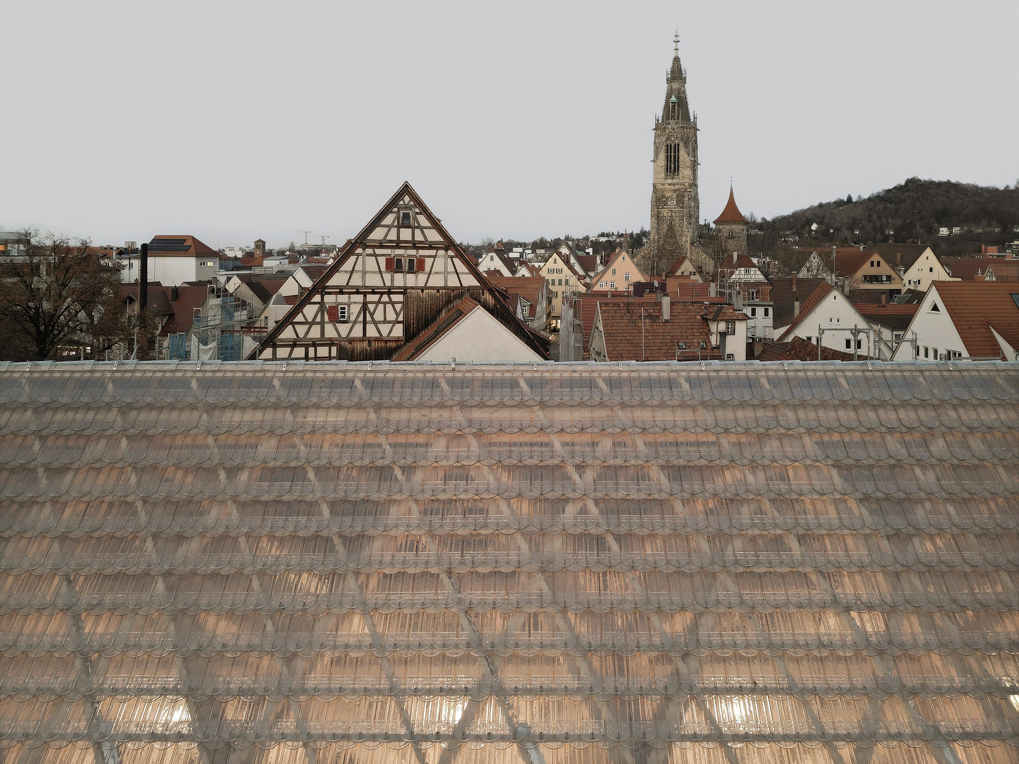 The new building's geometrically complex, load bearing wooden structure was developed parametrically. The architectural requirements and constructive logic align precisely. A triple-layer, gradually dissipating substructure of diagonally and horizontally overlapping wooden members carries the glass beaver-tail tiles as external cladding for weather protection.