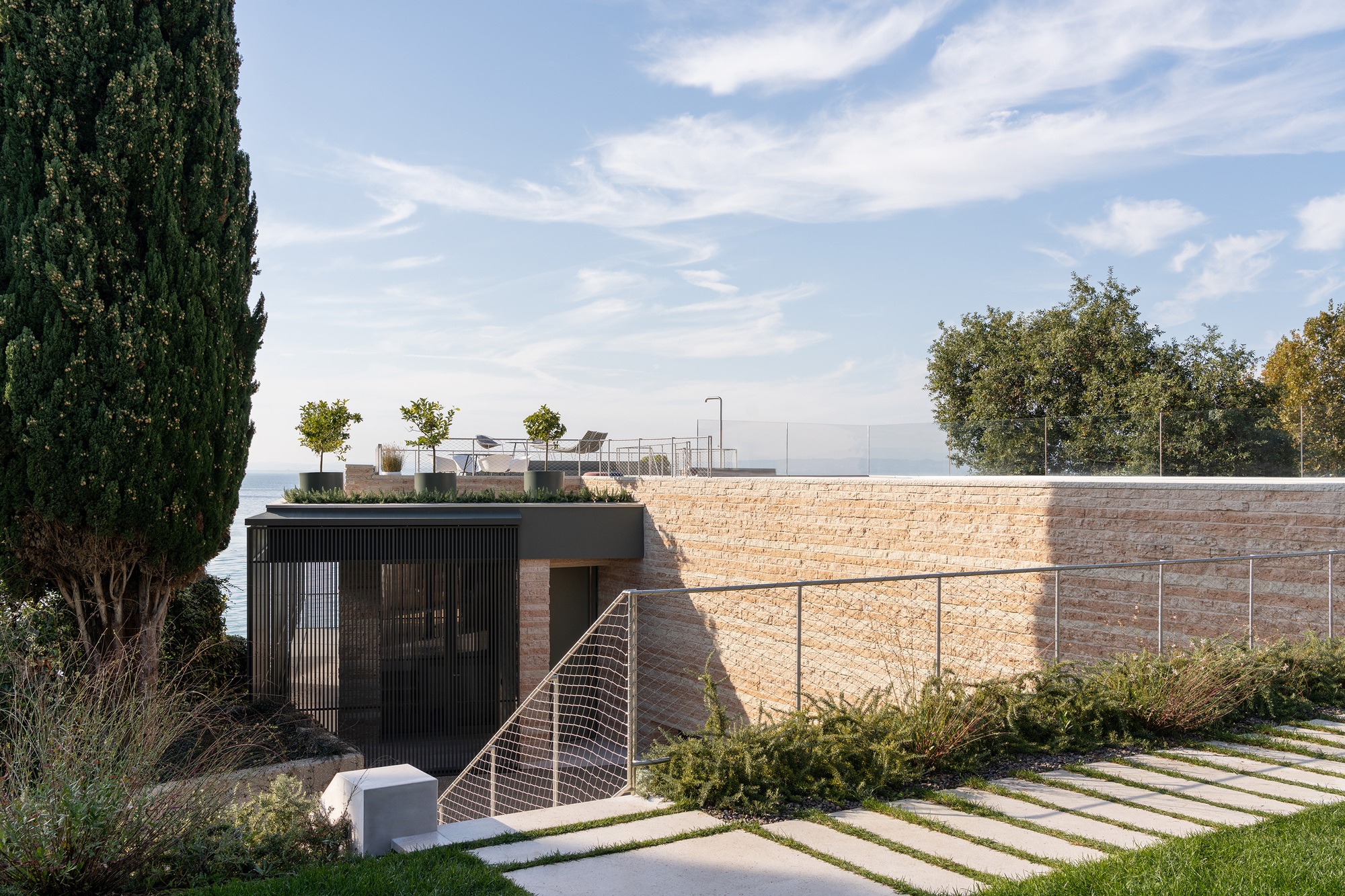 A palette of neutral, pale hues echoes the tones of local stone and the natural lake banks. The cladding in pinkish Lessinia stone, laid in horizontal bands with a split face finish, recalls the stratification of the hillside rock, accentuating the continuity between the built form and the landscape. The solar shading, window frames, and metallic elements adopt the silvery-green tones of the surrounding olive groves. Balustrades alternate between glass panes and stainless steel mesh on tubular frames, evoking nautical details while ensuring visual permeability.