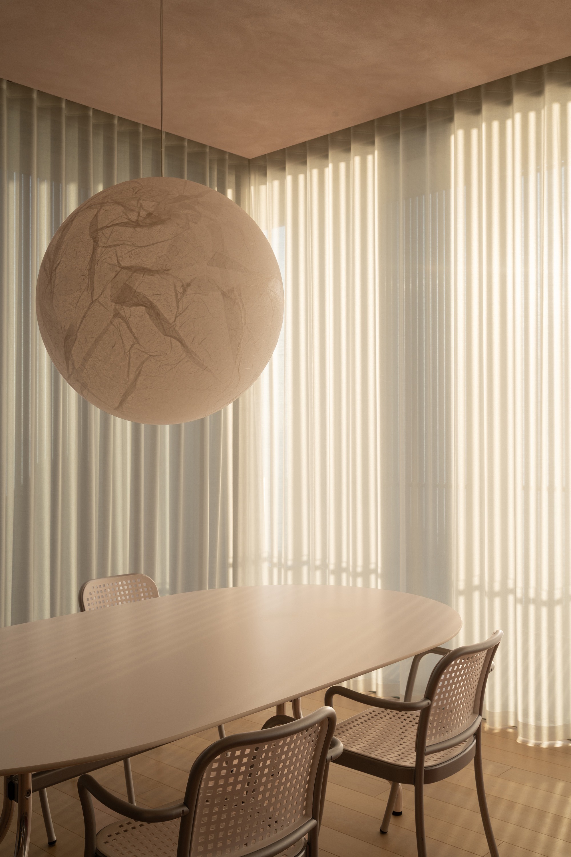 호수를 마주 보는 입면은 환경 조건과 외부와의 관계를 유연하게 조절하는 가변형 패널 중심의 이중 파사드로 설계되었다. 건물 전면은 개폐가 가능한 로지아로 둘러싸여 있다. 그리고 3중 트랙 위를 미끄러지듯 움직이는 수직 알루미늄 루버가 거실의 널찍한 창문을 부드럽게 감싸 안는다. 이 정교한 메커니즘 덕분에 일조량과 프라이버시를 정밀하게 제어하는 동시에 시각적이고 공간적인 경계를 모호하게 섞어낸다. 패널들이 최소한으로 겹쳐질 때는 내부를 온전히 가려주는 균일한 스크린이 되지만 완전히 열어젖히면 1층 매스의 물리적 경계가 사라지며 내부 공간이 호수와 직접적으로 교감하게 된다.