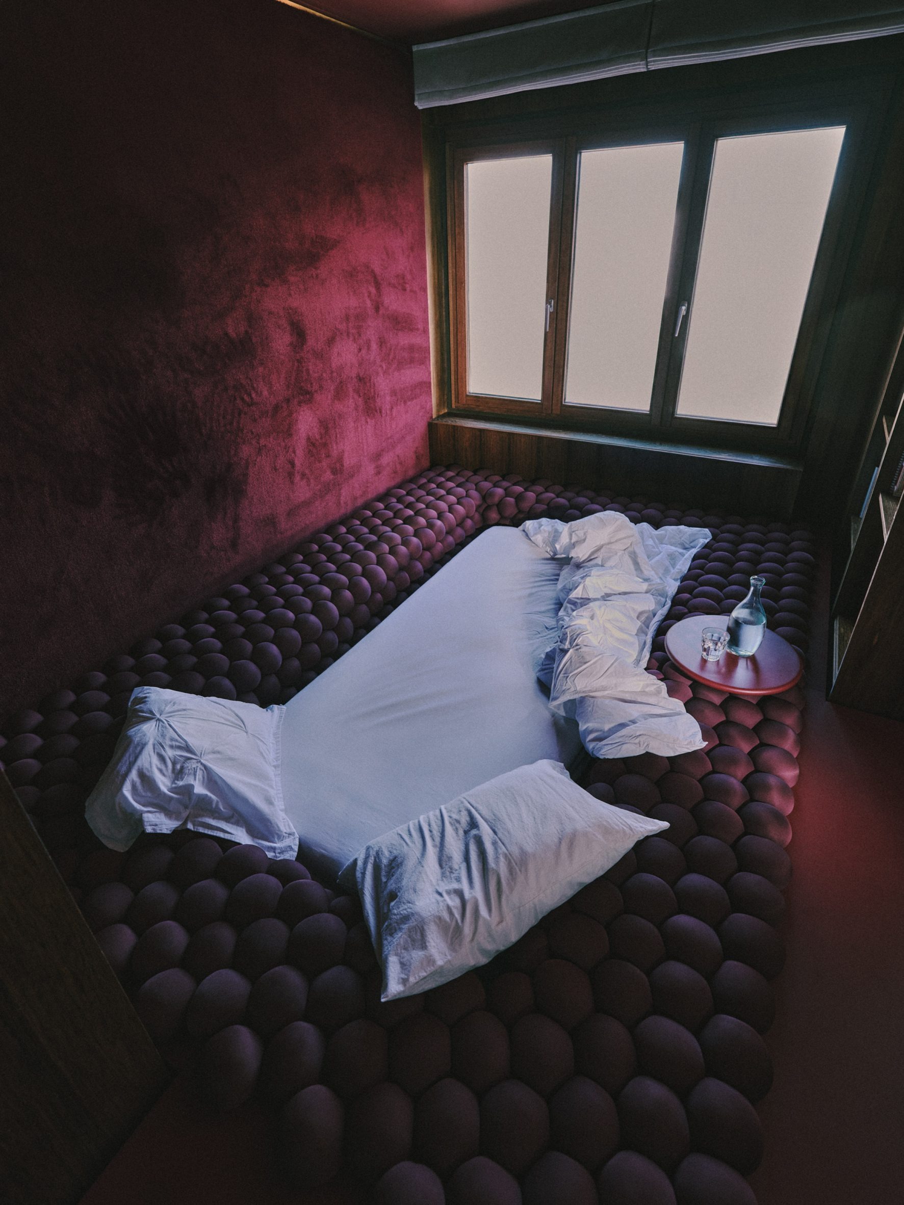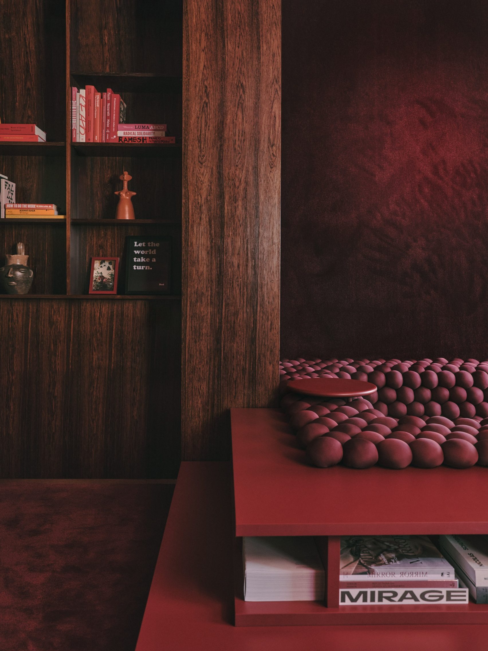 The Brussels project features balls upholstered in a deep-red hue that complements the velvet covered walls and the joinery of the mid-century interior designed by Jules Wabbes.