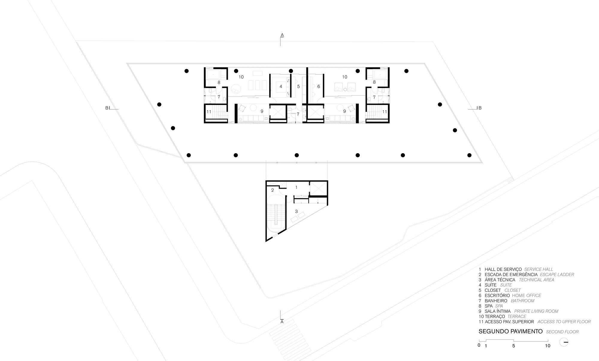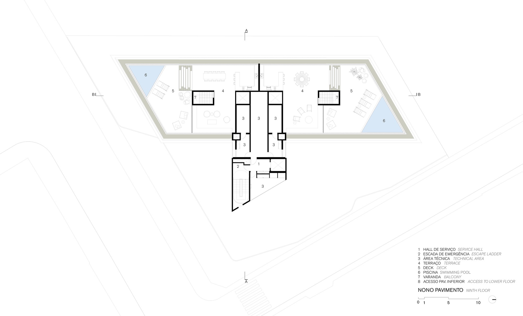 The project directly responds to the conditions of the surroundings and takes advantage of the strategic location — next to an exclusively residential neighborhood with low rise buildings — and the trapezoidal shape of the lot to create apartments with generous balconies and wide views of the sunset.