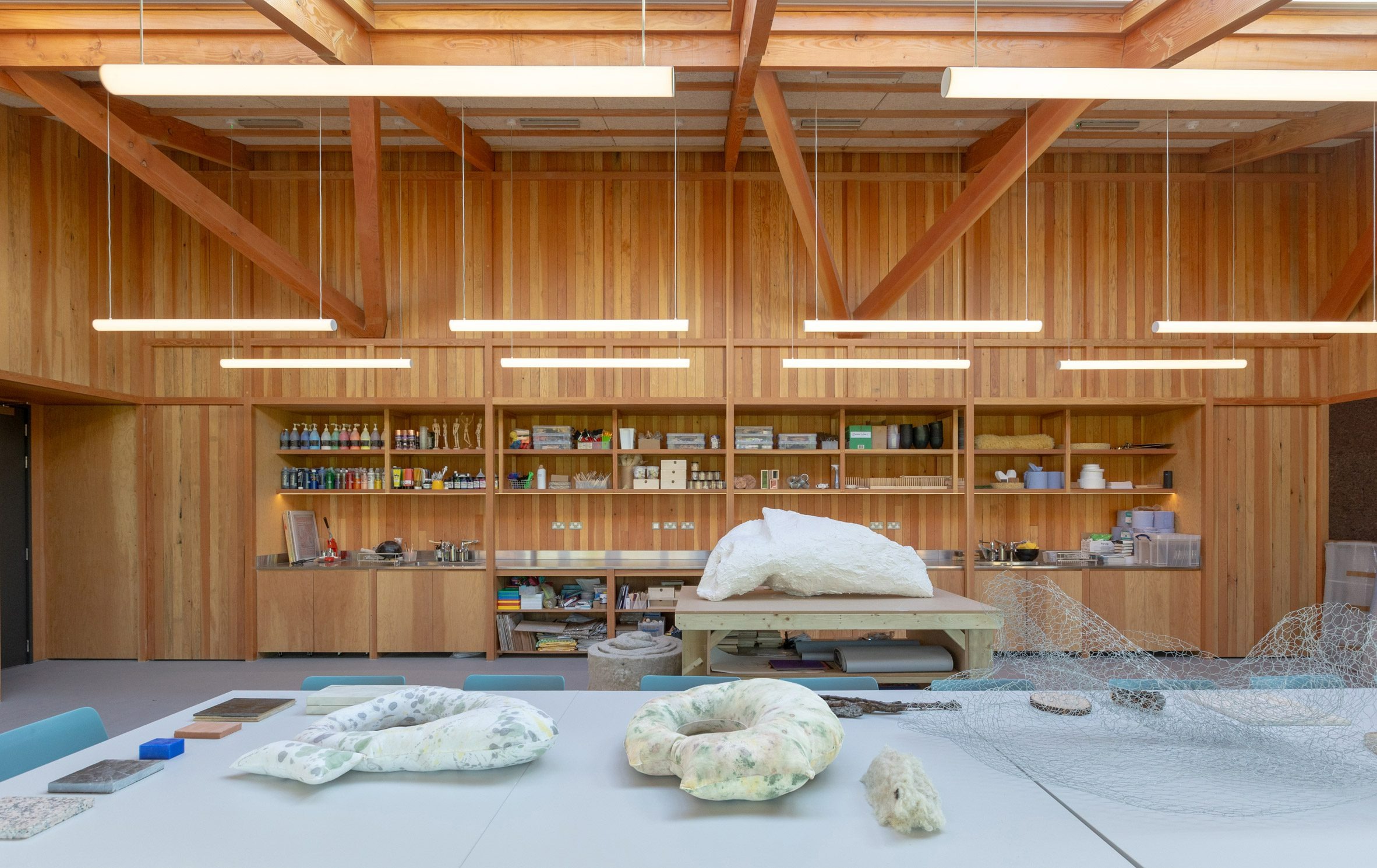 There are two workshop rooms, each with windows that frame the landscape and access to an adjoining sheltered outdoor area for lessons to spill outside in warm weather. Tables fill the spaces, while a bespoke trolley by design studio Plaey references Moore's sculptures.