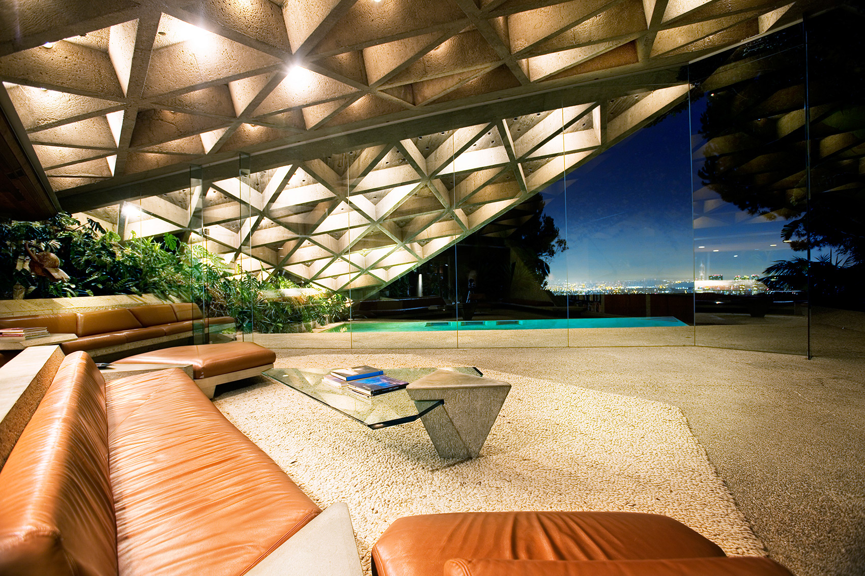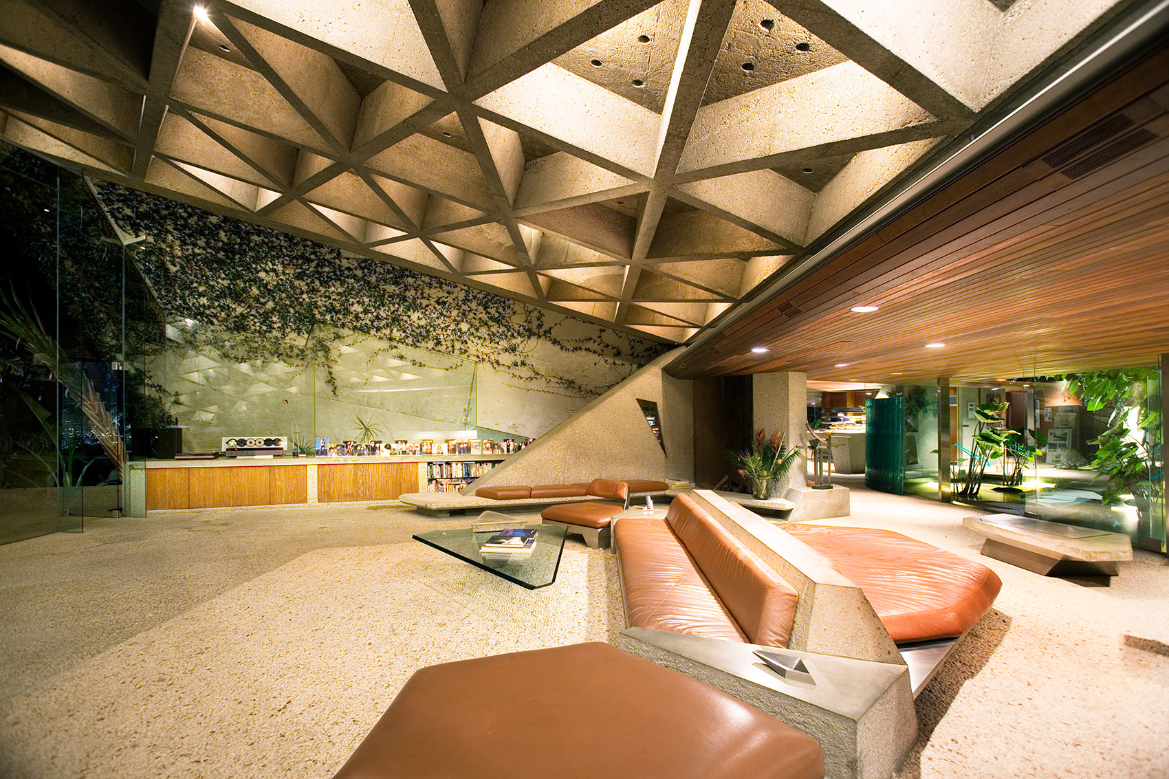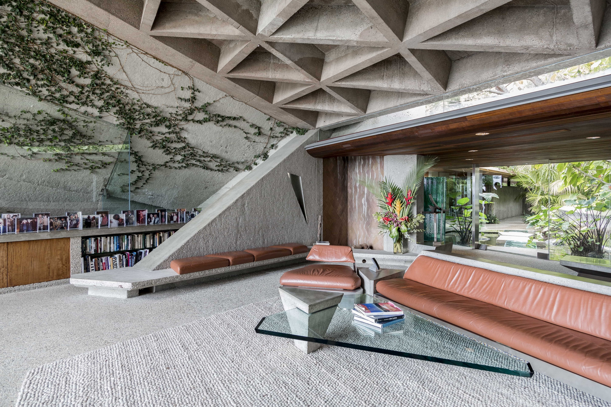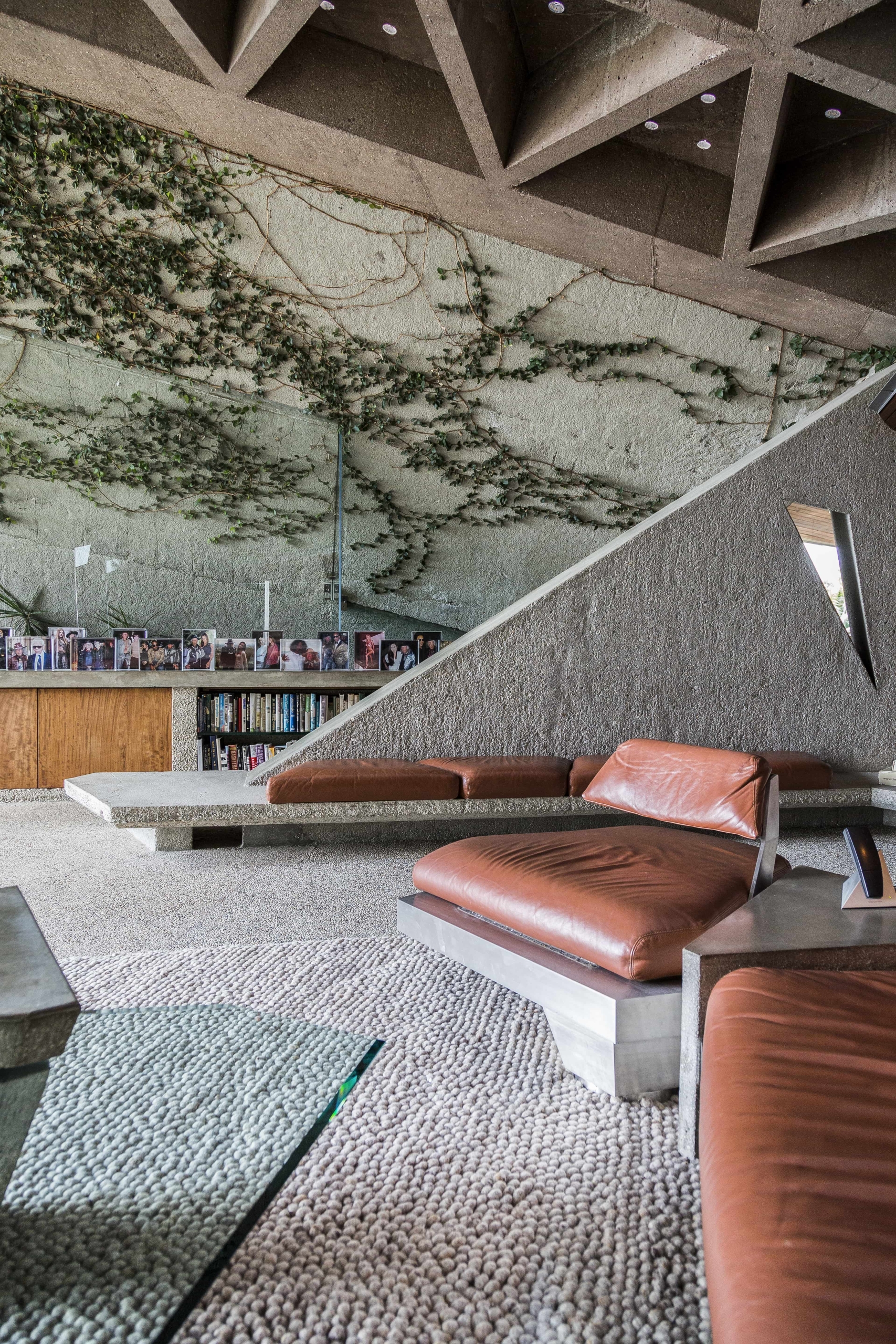 Opposed to building anything that resembled a box, John Lautner designed the home with angular walls, built-in furniture and an open plan floor space. Wanting the house to feel outwardly connected with no separation between inside and out, John and James have used concrete and glass. Comprising the floors and walls, concrete became the main material employed, whilst all the carpets installed have been designed to look like small stones. Additionally, the frameless glass wall in the living room supports the uniting of the two spaces. Rewarded with views across Los Angeles, the home is embraced by creeping vines that crawl over the walls, and tropical vegetation complements the structure’s exterior.