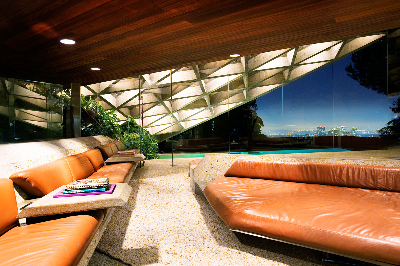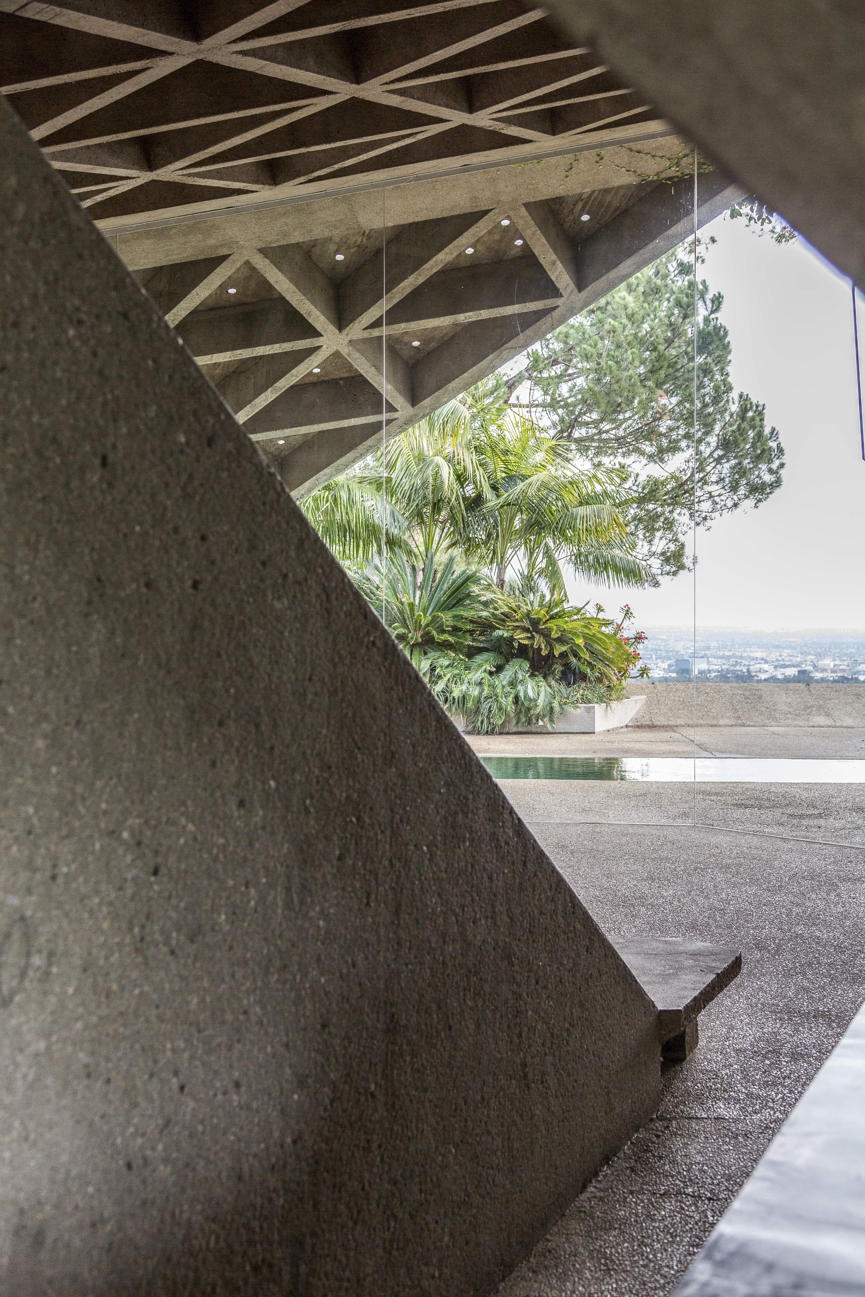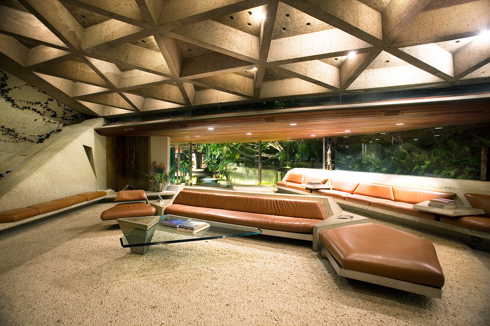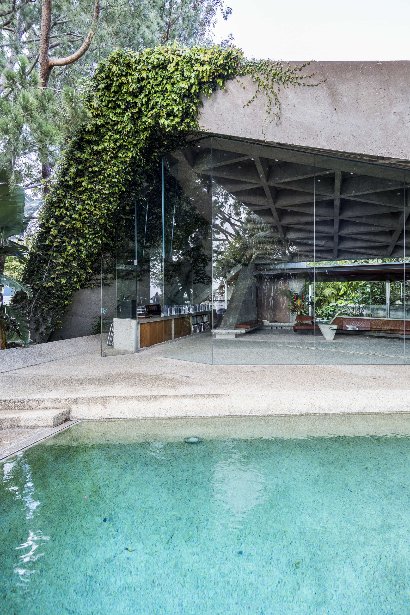Opposed to building anything that resembled a box, John Lautner designed the home with angular walls, built-in furniture and an open plan floor space. Wanting the house to feel outwardly connected with no separation between inside and out, John and James have used concrete and glass. Comprising the floors and walls, concrete became the main material employed, whilst all the carpets installed have been designed to look like small stones. Additionally, the frameless glass wall in the living room supports the uniting of the two spaces. Rewarded with views across Los Angeles, the home is embraced by creeping vines that crawl over the walls, and tropical vegetation complements the structure’s exterior.