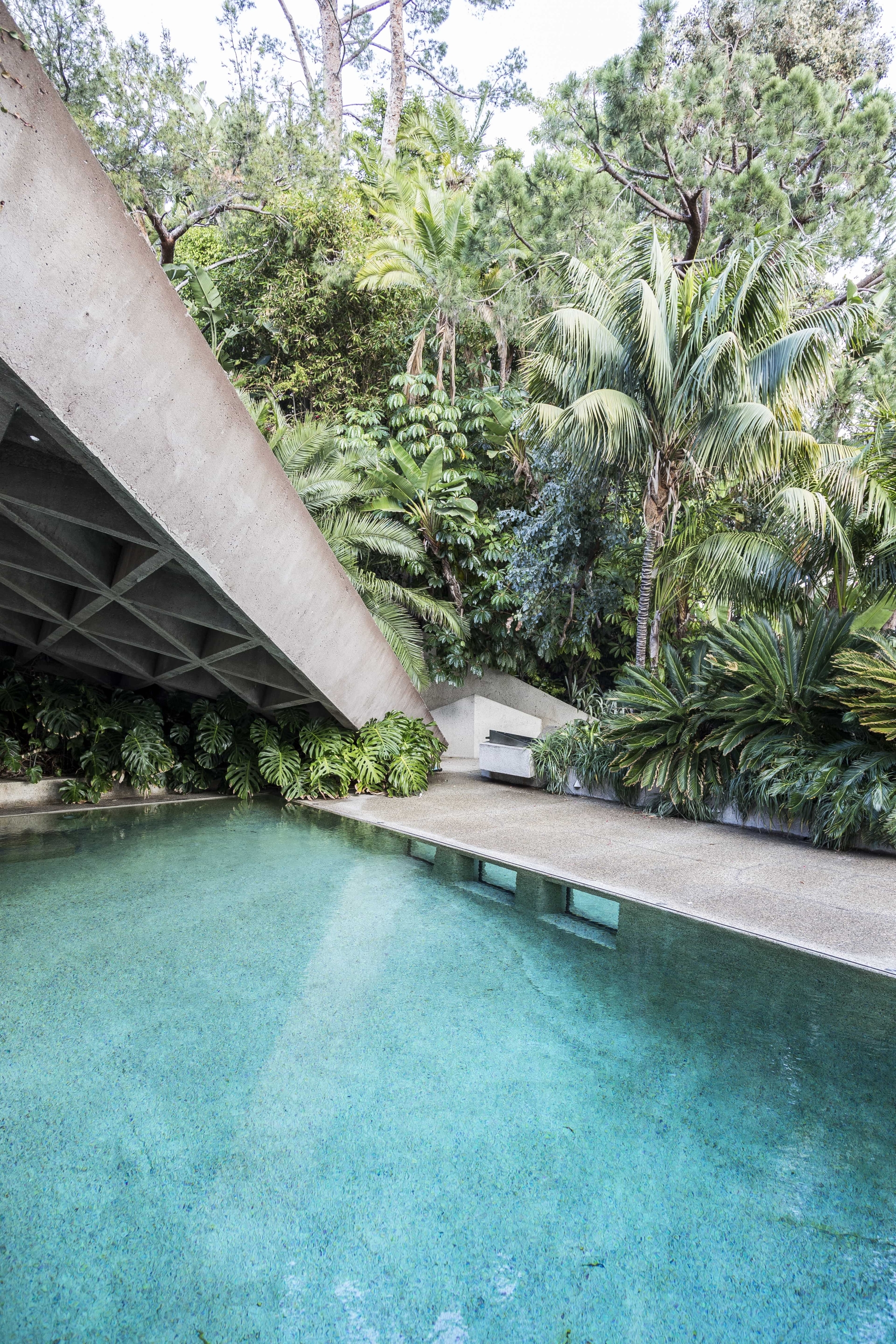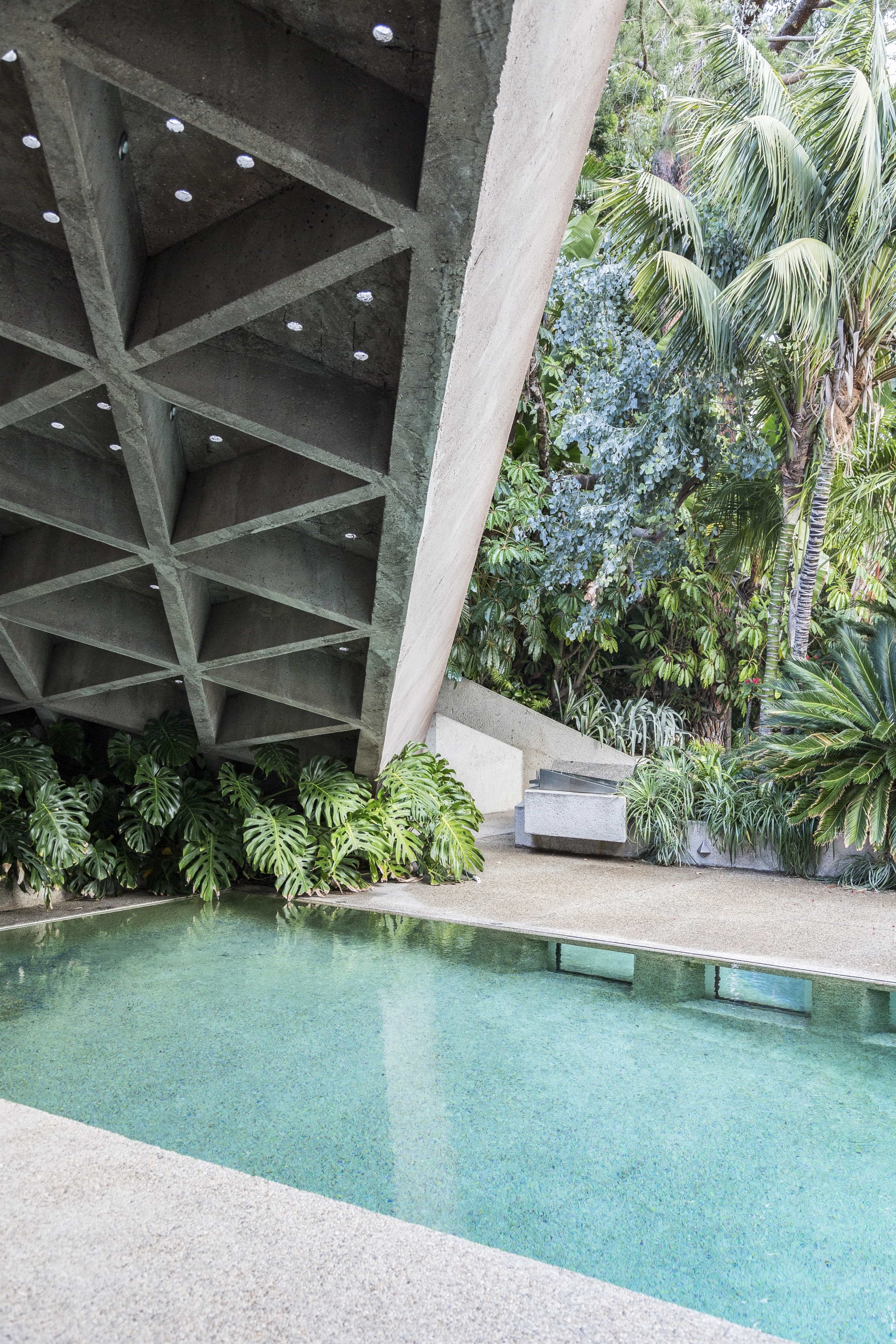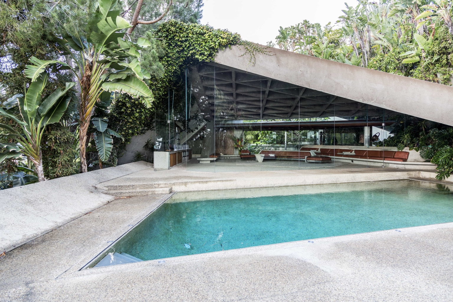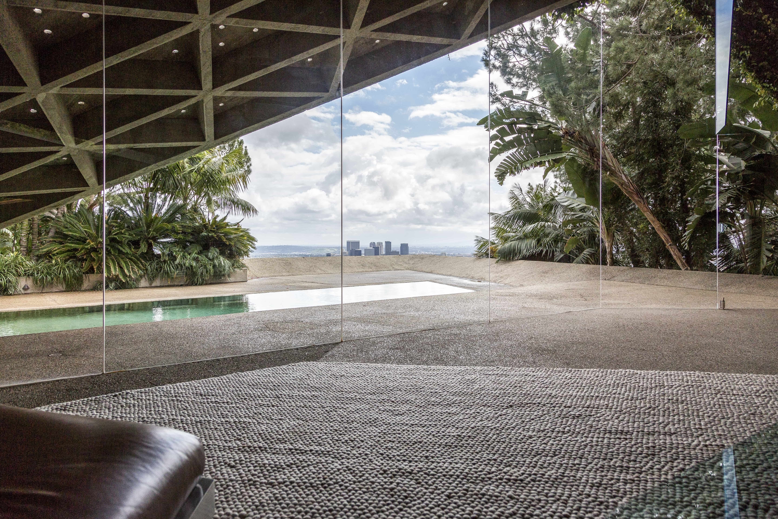 Opposed to building anything that resembled a box, John Lautner designed the home with angular walls, built-in furniture and an open plan floor space. Wanting the house to feel outwardly connected with no separation between inside and out, John and James have used concrete and glass. Comprising the floors and walls, concrete became the main material employed, whilst all the carpets installed have been designed to look like small stones. Additionally, the frameless glass wall in the living room supports the uniting of the two spaces. Rewarded with views across Los Angeles, the home is embraced by creeping vines that crawl over the walls, and tropical vegetation complements the structure’s exterior.
