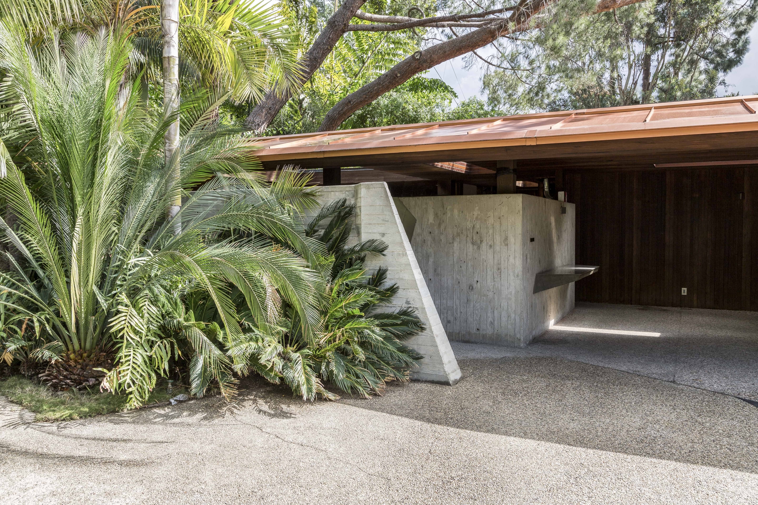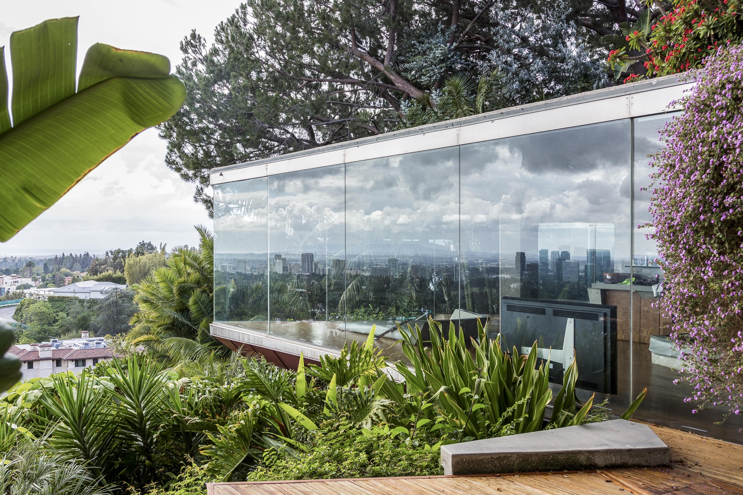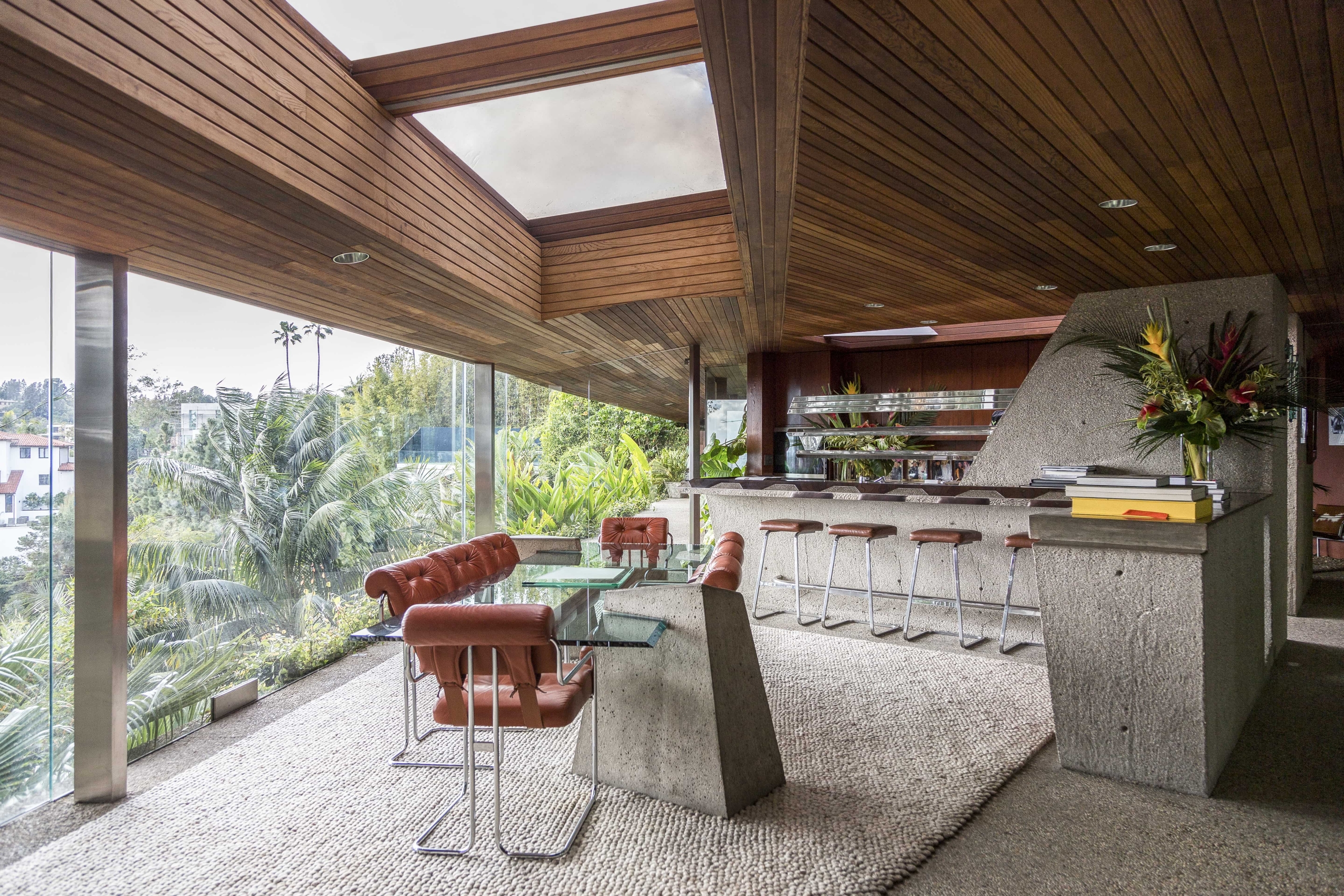 Rewarded with views across Los Angeles, the home is embraced by creeping vines that crawl over the walls, and tropical vegetation complements the structure’s exterior.
