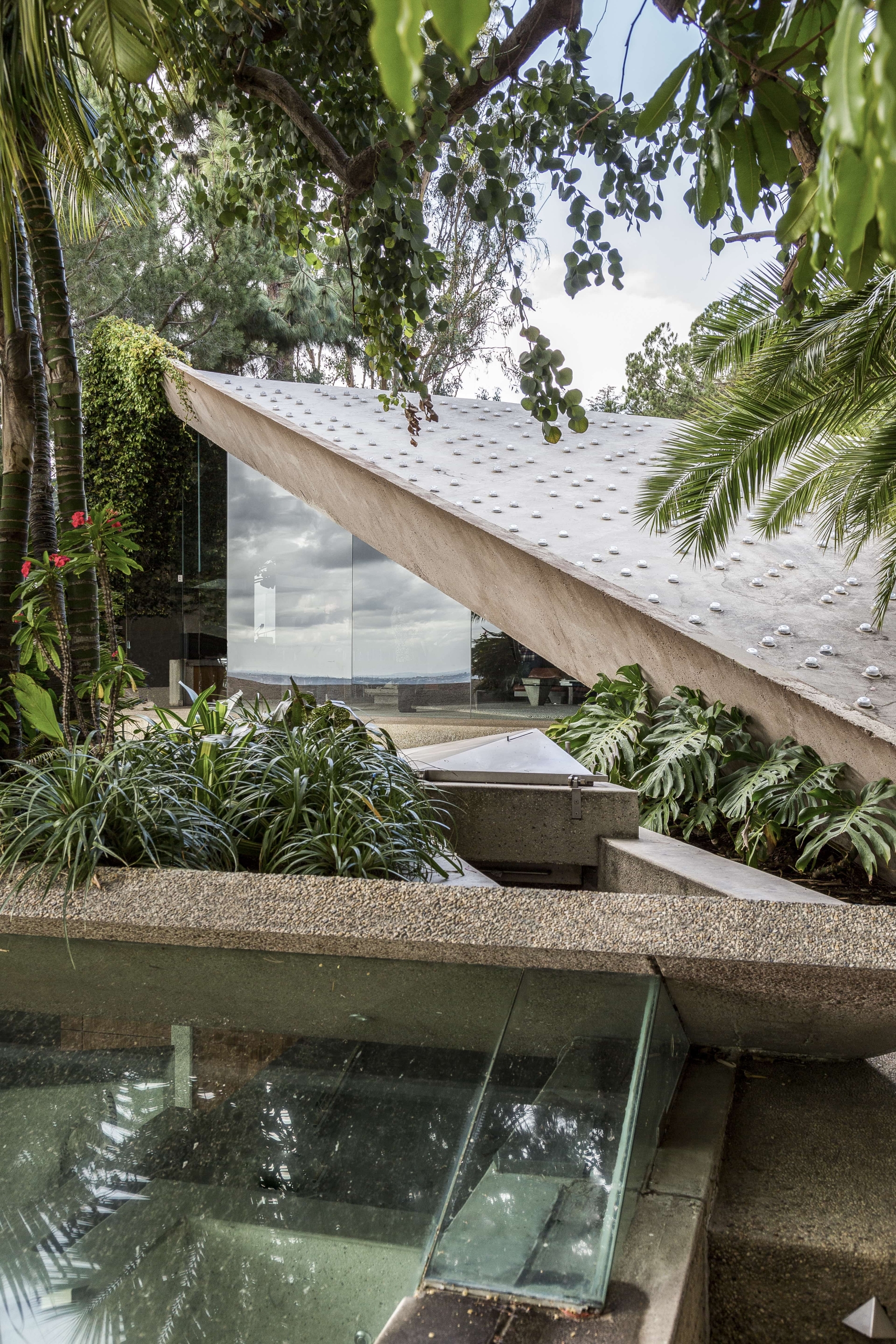 Spanning across over 1.5 hectares of hillside, the property is saturated with thick foliage and vegetation that hold walkways, ponds and hidden grassed spaces that become a crucial part of the home’s external characteristics. Additionally, the distinct character of Sheats-Goldstein Residence is further emphasised with a one-of-a kind James Turrel skyscraper. Named Above Horizon due to its position on the hillside, the skyscraper has been built into the slope just below the main building. Designed with two windows that open to reveal glimpses of the sky, the volume also has a built-in lounge that allows for one to lay back and watch the thousands of hidden LEDs. Completed after John’s passing, the skyscraper, terrace, office space and Club James – the nightclub underneath the house – were all done by James with a deep understanding and respect for John’s original design.