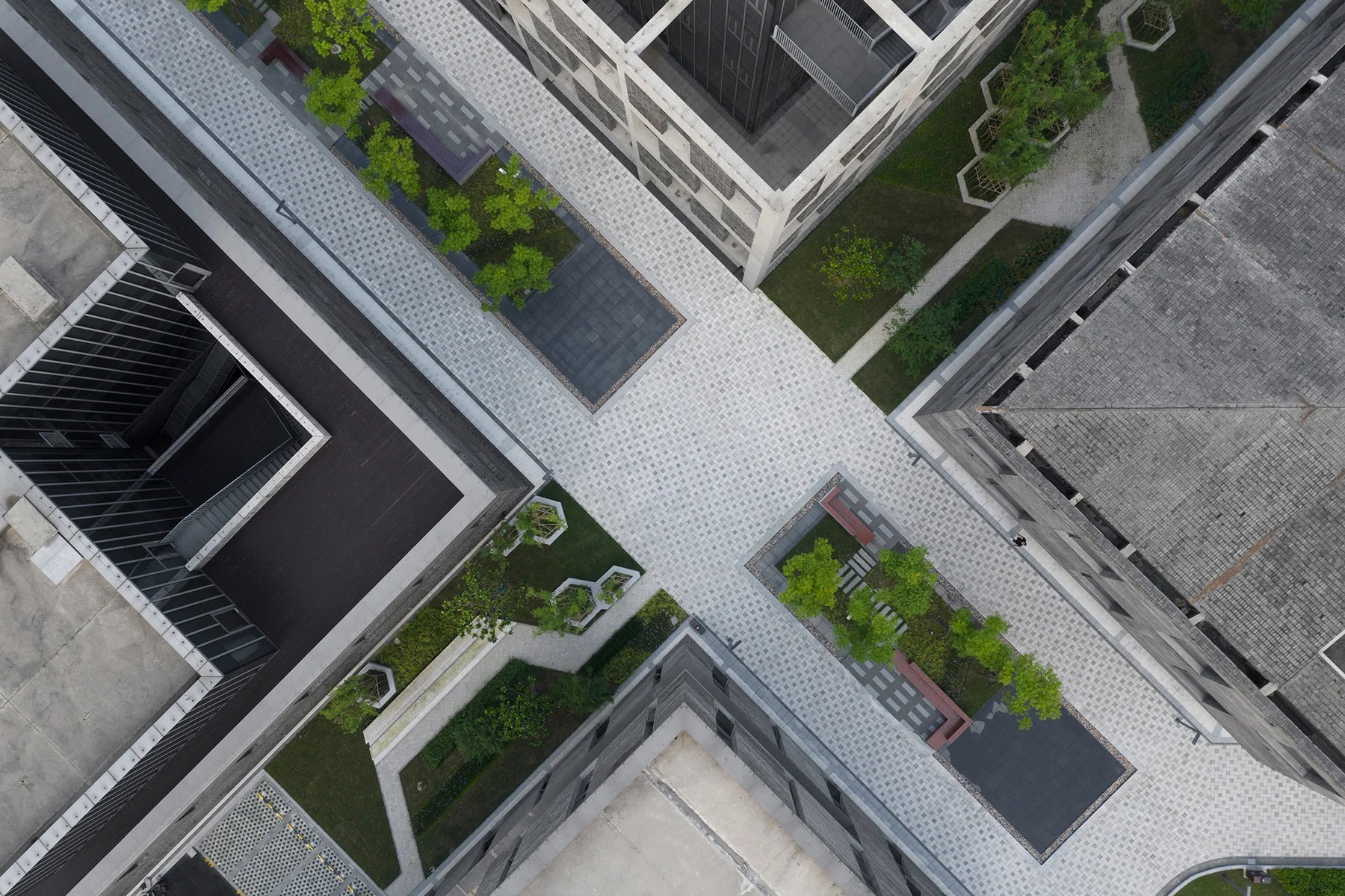 when developing the ‘jiading mini-block’, atelier FCJZ began by asking the question ‘how small can a block be?’. as an office park is typically suburban and accessed mainly in private cars, the architects were realistic about their goals. ‘to achieve urbanity in an office park may be too tall an order, but perhaps we could try to at least invite people to come out and walk around during their lunch break?,’ continues the team.