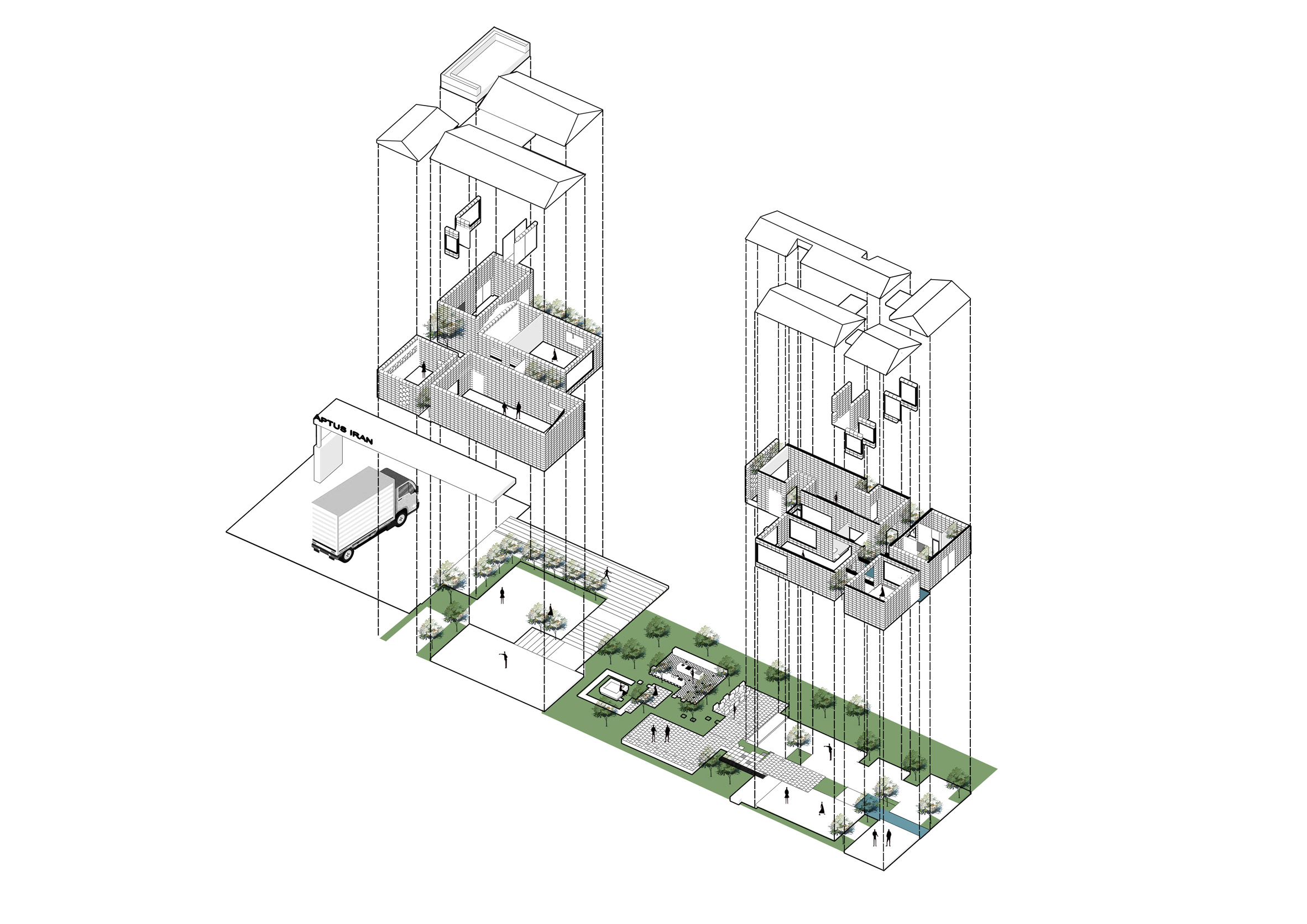 "The created voids between the boxes form greenspaces penetrating into the building."