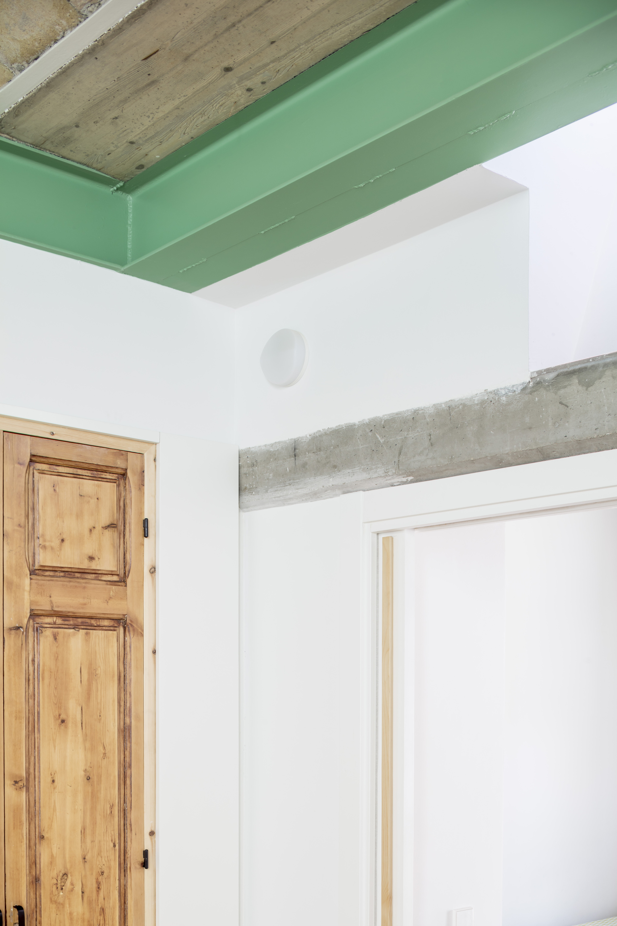 Despite these issues, the building boasted some magnificent original features, such as great ceiling height between the two stories, ample width between the dividing walls, as well as charming structural and joinery/trim details that gave the building a character that we wanted to preserve. After selecting, cleaning, and restoring the distinguishing features to be preserved, the end result is a space where the original features contrast with newly built elements to create overlapping layers that stand testament to the history of the building and the lives written in its walls.
