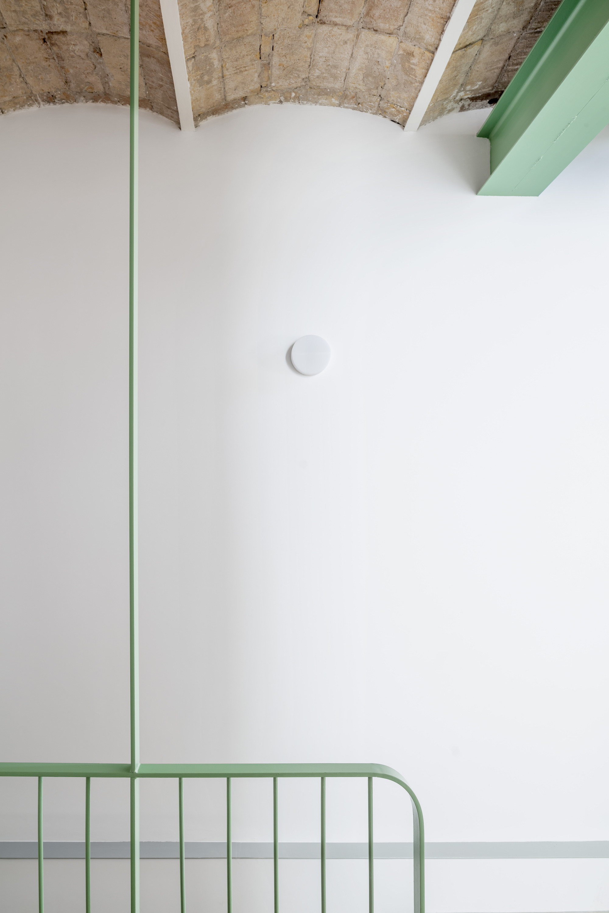 백색을 바탕으로 하는 미니멀 공간 속에서 녹색은 공간에 활력을 불어 넣는 요소로 적용되는 동시에 구조보강을 담당한다.