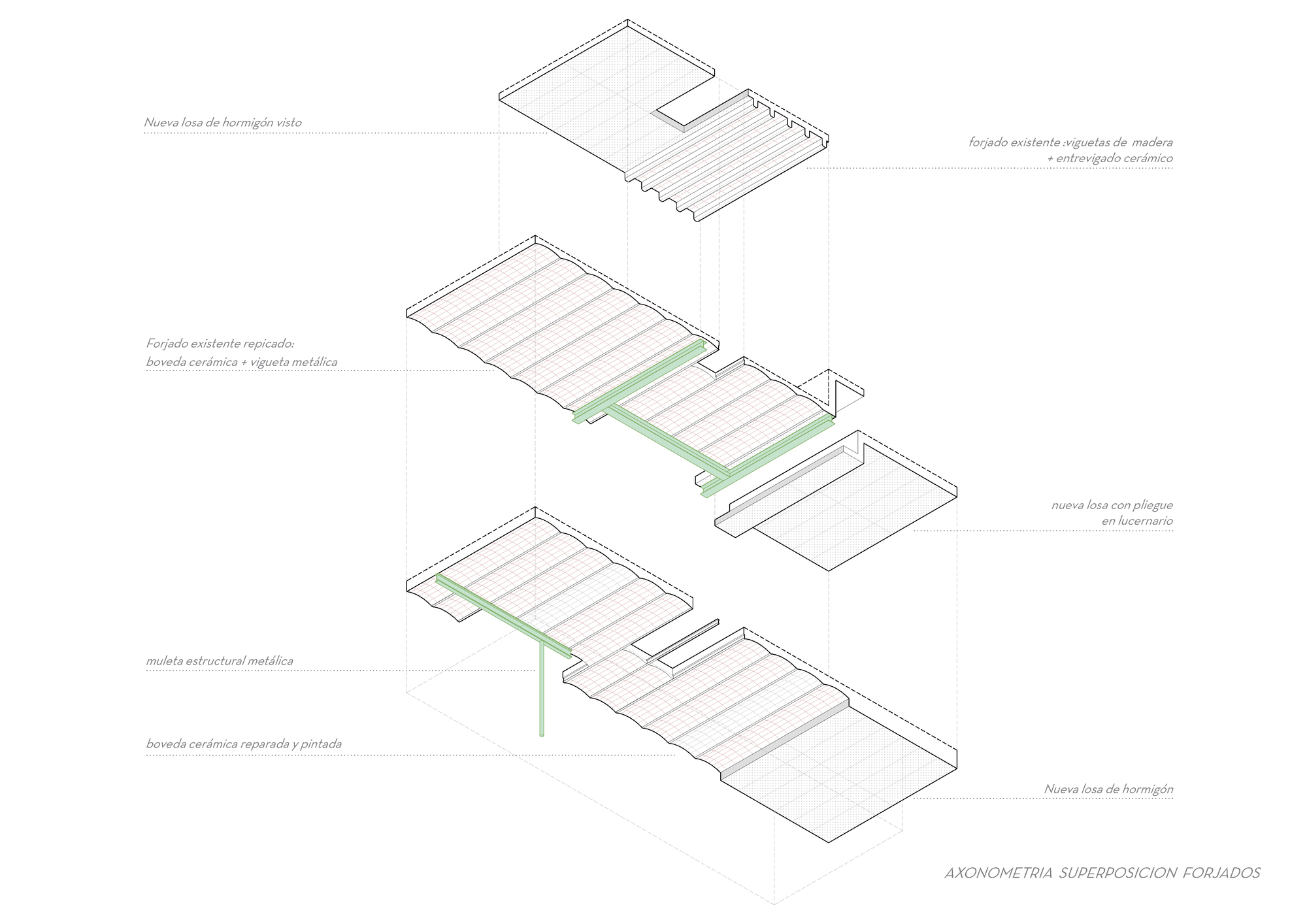 The exposed ceilings of the house act as a film reel that provides us a glimpse into each consecutive phase of its construction and restoration process. The original vaulted brick ceiling with metal beams is left exposed for a clean look and is interlaced with the new concrete slabs and steel beams used for structural reinforcement. The aim is for each layer to reveal, through its differentiated textures and colours, the passing of the years and to highlight the new additions and modifications.