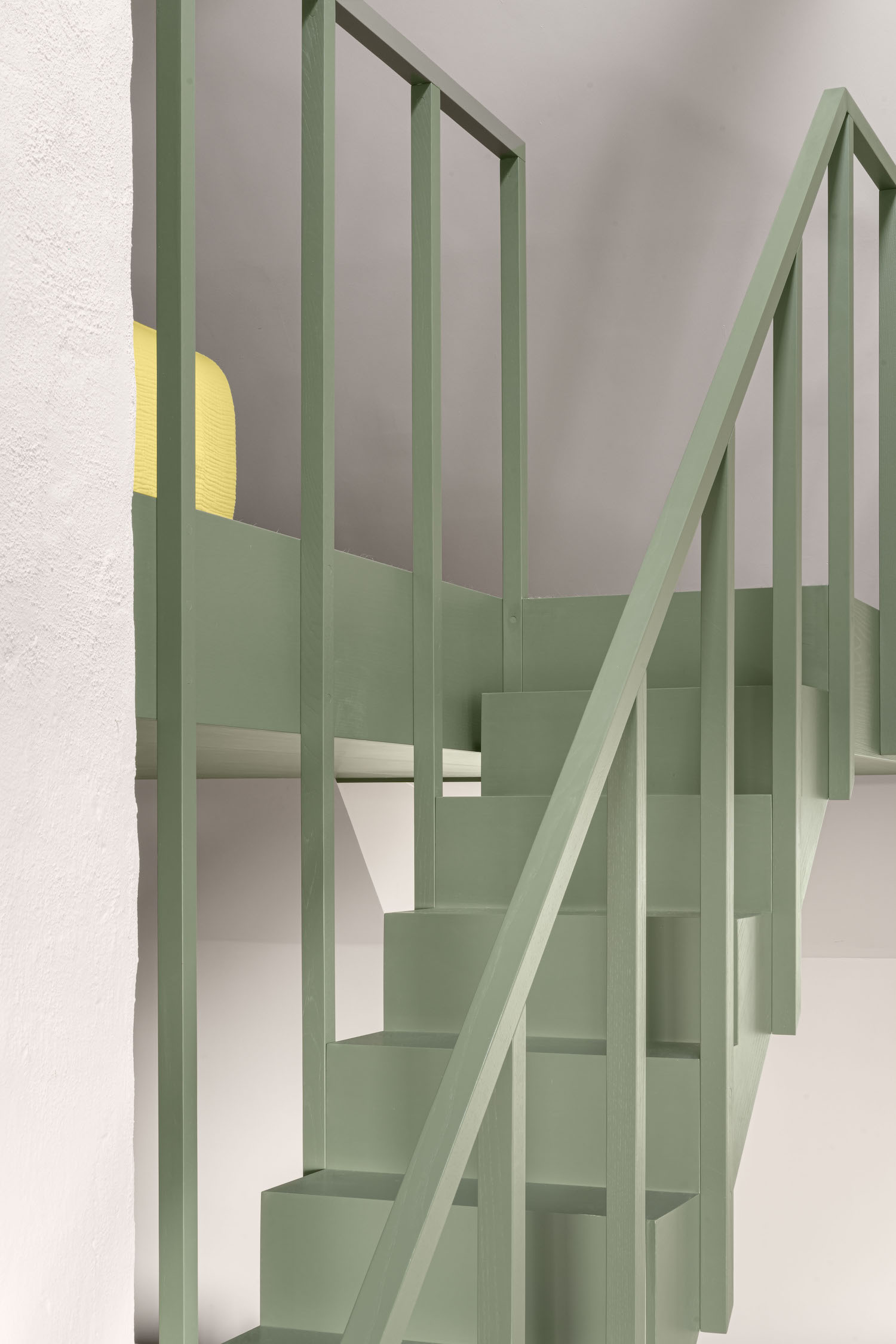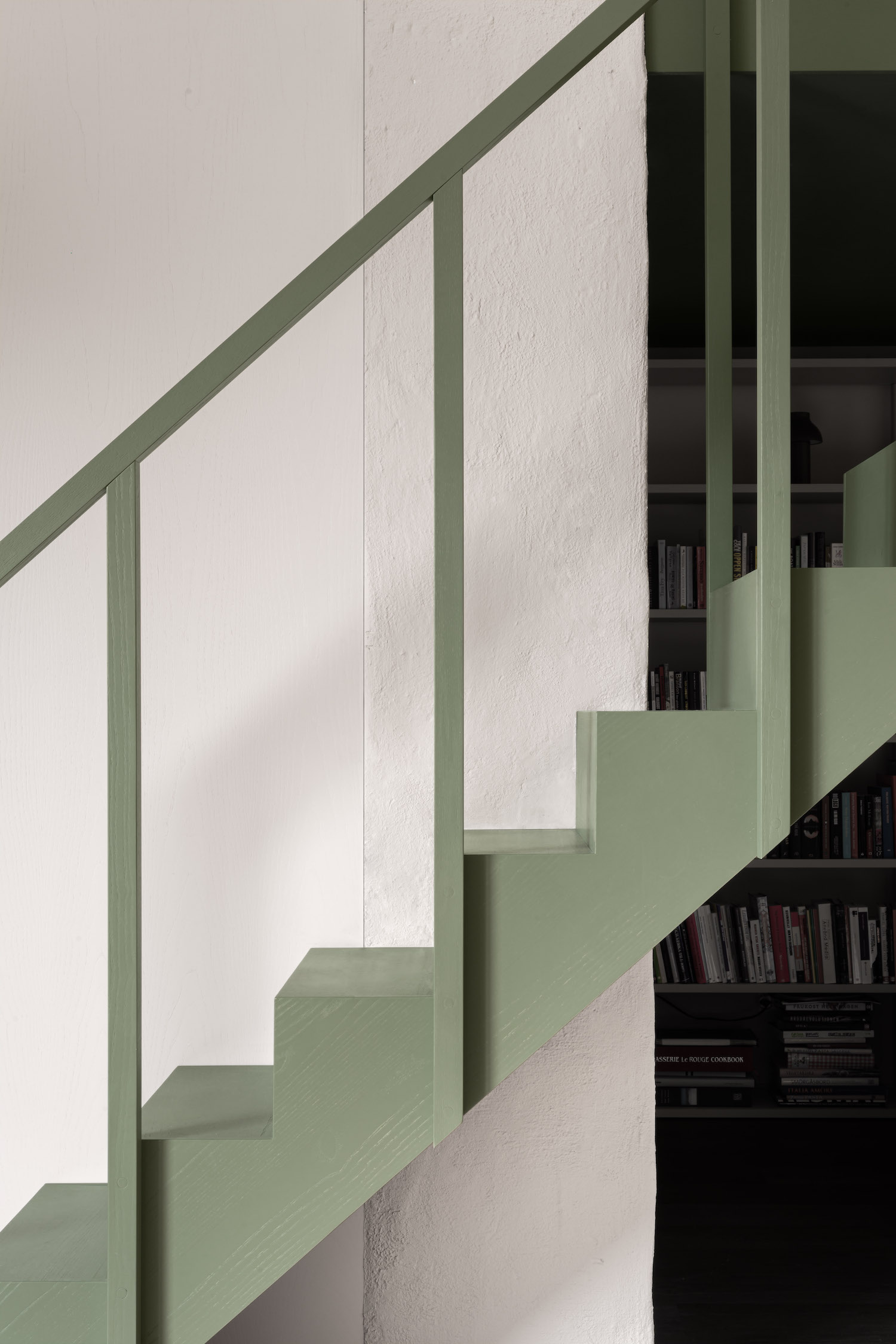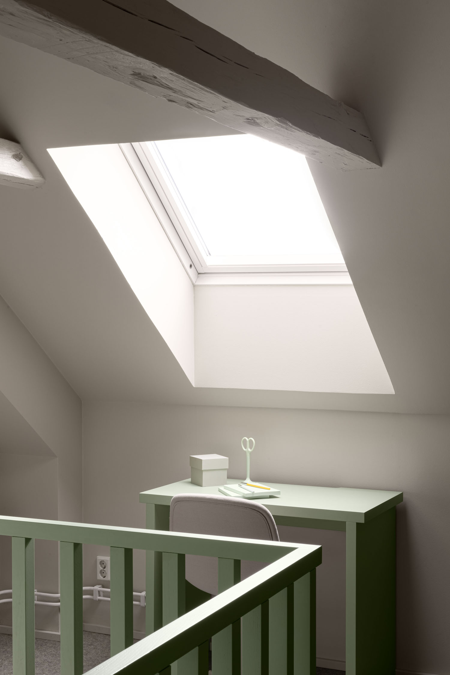 The new layer is given a very simple, uncomplicated expression and each was intentionally designed as a unit, to appear as if it’s been pushed into place snugly within the original architecture. Each unit also has its own color, as though everything is made from life sized building blocks. The existing kitchen was dressed in the same green as the new loft on top of it so it appears now as one seamless block.
